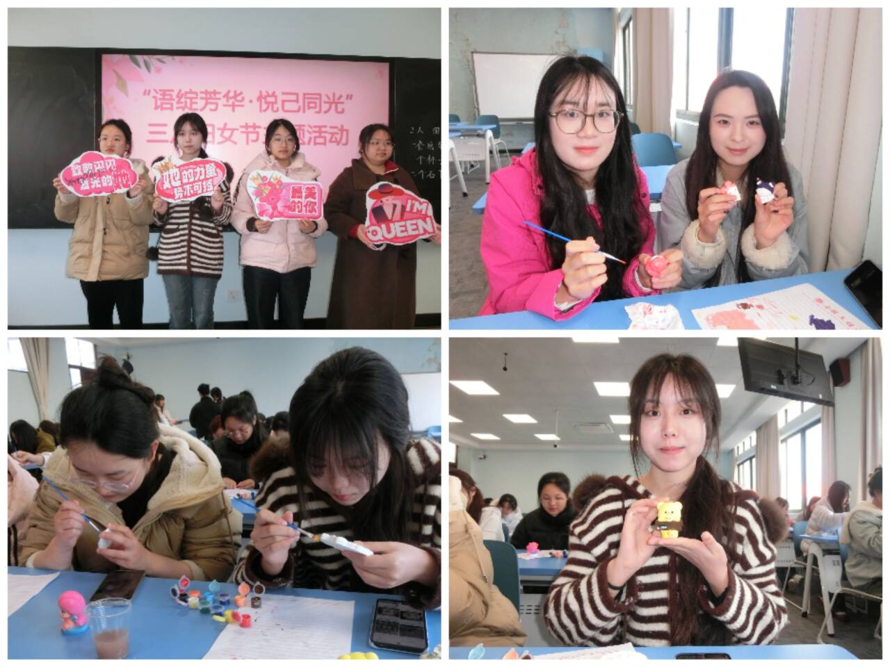 手作抒怀,绘就“她”色彩。问答环节的余温未散,创意手工区便成为同学们释放灵感、寄托心意的天地。素白的石膏娃娃整齐陈列,丙烯颜料如彩虹般铺展桌面,画笔、调色盘错落摆放,一切都为创意绽放做好了准备。同学们执起画笔,细细勾勒、慢慢晕染,或描摹异域文学中的女性形象,或书写多语种的美好祝福,“Women hold up half the sky”的字样在石膏上静静绽放,每一笔都藏着对女性力量的赞美,每一种色彩都承载着对悦己生活的向往。一笔一画间,想象肆意流淌,情感悄然沉淀,原本素净的石膏娃娃,在同学们的巧手下,变成了独一无二的专属藏品。