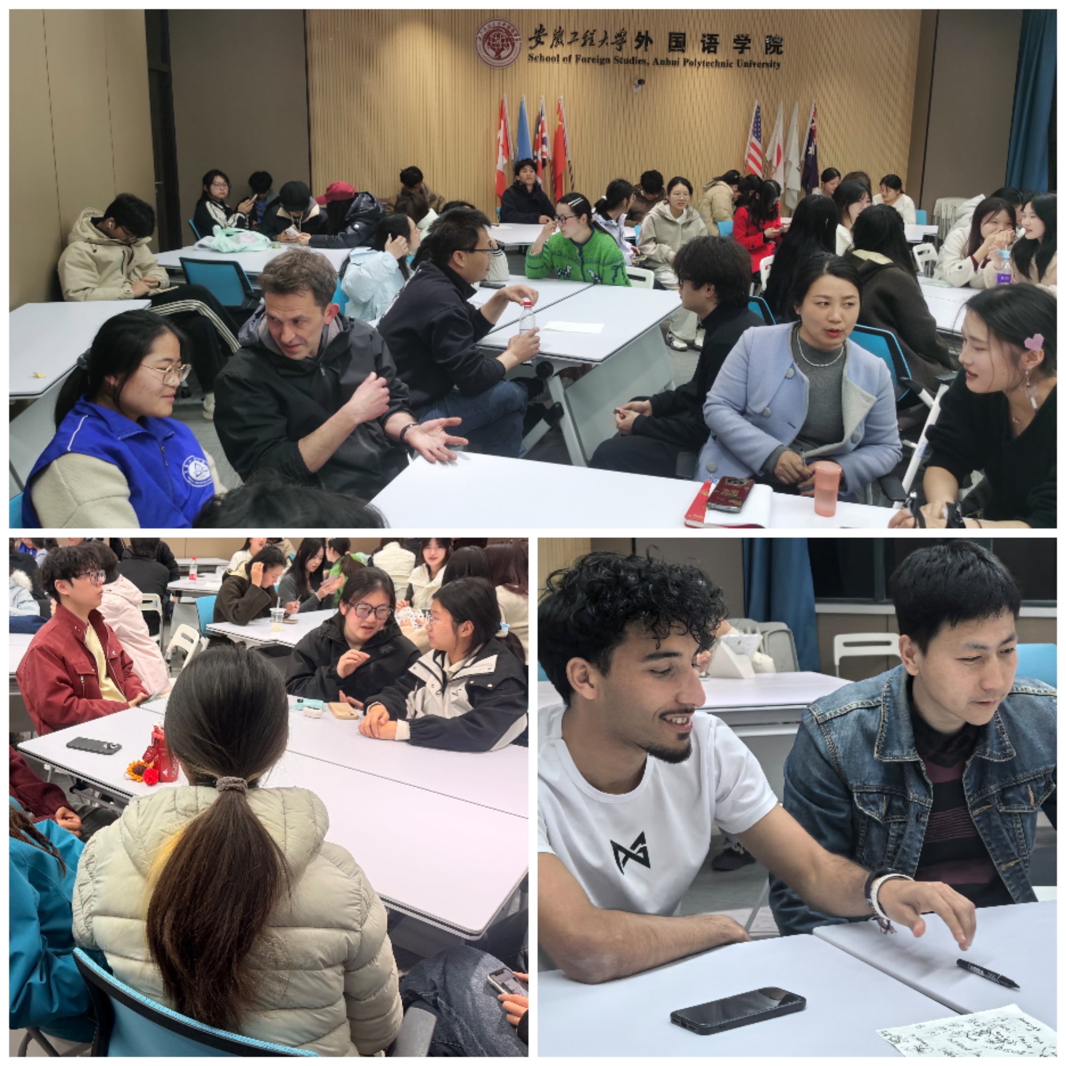 3月13日晚,由外国语学院主办的新学期首期“口语广场—英语角”活动在9教209教室温情启幕。本次活动吸引了在校中外师生和驻芜企业人员等共计100余人参与,涵盖全校多个专业,现场气氛热烈、交流融洽。