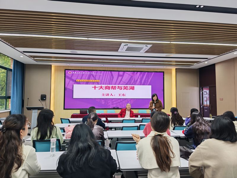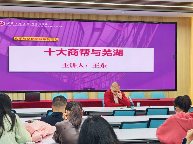 为深化师生对中华商帮文化的认知,挖掘商帮文化与芜湖地域发展的深层关联,拓宽跨文化研究视野,4月22日下午,外国语学院“文学与文化”科研团队邀请芜湖市委党史地方志办公室调研员王东教授开展“十大商帮与芜湖”专题学术报告。团队成员,学院相关专业教师以及研究生参加了此次活动。活动由文学与文化团队负责人张凤梅教授主持。