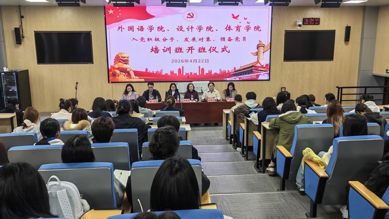 4 月 22 日下午,校党校第五片区 2025-2026 学年第二学期发展对象培训班,暨外国语学院分党校入党积极分子、预备党员培训班开班仪式在 5J217 会议室隆重举行。校党校督导组成员谈丽华、外国语学院党委副书记李校林、体育学院党委副书记马晓琼、设计学院党委副书记陶冶出席仪式,培训班班主任陈小庆主持开班仪式。