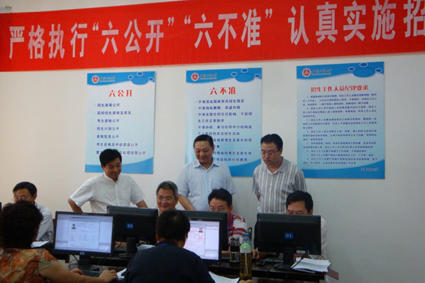 6月30日,随着山西省普通高等学校艺术类专业招生录取工作的开始,今年我校的高考招生录取工作全面展开。2010年我校共计划招生4400人,面向江苏、浙江、湖南、福建、广西等全国17个省份。 为全面实施高校招生“阳光工程”,确保我校利用远程网络顺利完成今年的招生任务,招生工作在严格遵守教育部“六公开”、“六不准”、“六禁止”及相关制度的前提下,学校成立了由干洪校长担任组长的招生工作领导小组,同时下设录取组、网络技术组、纪检组、保卫组和后勤组,各工作小组根据有关规定,依法组织开展,从不同环节做好招生录取工作。同时,学校在招生网上及时准确地向考生公开、公示有关录取政策、录取结果等信息,还通过热线电话、张贴栏等提供有关查询。在招生录取现场,招生工作人员冒着高温酷暑,坚守岗位,认真细致地进行招生录取工作。首先,始终坚持“公平公正、择优录取”原则,坚决维护考生利益,认真审阅考生档案,全面考察学生素质;其次,严格遵守相关招生政策,依法治招,严格按招生章程录取。 校党委副书记、校长干洪,副校长叶常林,校纪委书记汪奇燕等领导先后几次到录取现场指导和检查了今年的招生录取工作,详细了解学校招生工作进展情况。招生办主任、教务处处长柴阜桐根据录取情况分别就录取数据、志愿填报、生源质量等情况向领导们进行了汇报。干洪要求招生办认真分析录取数据,继续坚守岗位,希望下一步的招生工作仍然要深入贯彻实施招生“阳光工程”,真正做到公平、公正、公开的录取选拔。 干洪充分肯定了我校招生录取工作现已取得的成绩,对招生录取工作表示满意,对广大招生工作人员付出的辛勤劳动和无私奉献表示感谢。他指出,招生工作是提高学校办学水平、提高人才整体素质的前提,是很重要的一个环节,招生工作人员一定要把“以考生为本”贯穿整个招生工作过程,招生工作人员在招生工作中一定要坚持“公平、公正、公开”的原则,最大限度的保护考生利益。他希望所有招生工作人员在接下来的录取工作中继续本着对考生、对学校、对国家负责的态度,照章办事,依法而行,绝不能有半点疏忽;严肃认真,严密细致,绝不能有半点马虎;千方百计地确保更多优秀生源进入我校接受优质教育。 为了使高考招录工作公平公正,我校采取集中封闭式办公,从信息采集到招生计划的执行和档案录检等各个环节,都做到了多层把关。目前我校招生录取工作进展顺利,截至今日,我校共完成艺术批12省市的招生录取,录取新生500多人,尤其是今年首次招生的表演专业,取得了不俗的成绩,生源质量较高。普通文、理科招生,已完成山东、湖北、湖南、黑龙江等省的招生录取,今年录取形势普遍较好,生源质量较往年进一步提高,首次招生的黑龙江省顺利完成招生计划。安徽、江苏、甘肃、江西等省艺术类均是一志愿满额录取,湖南省、陕西省、湖北省录取分数线都有了较大提高,安徽省高考招生录取工作正在进行,学校将第一时间在招生网公布录取结果。 目前,我校的录取工作仍在进行,录取通知书的寄发、招生数据的发布及相关资料整理工作正在有条不紊的开展。(招生办)
