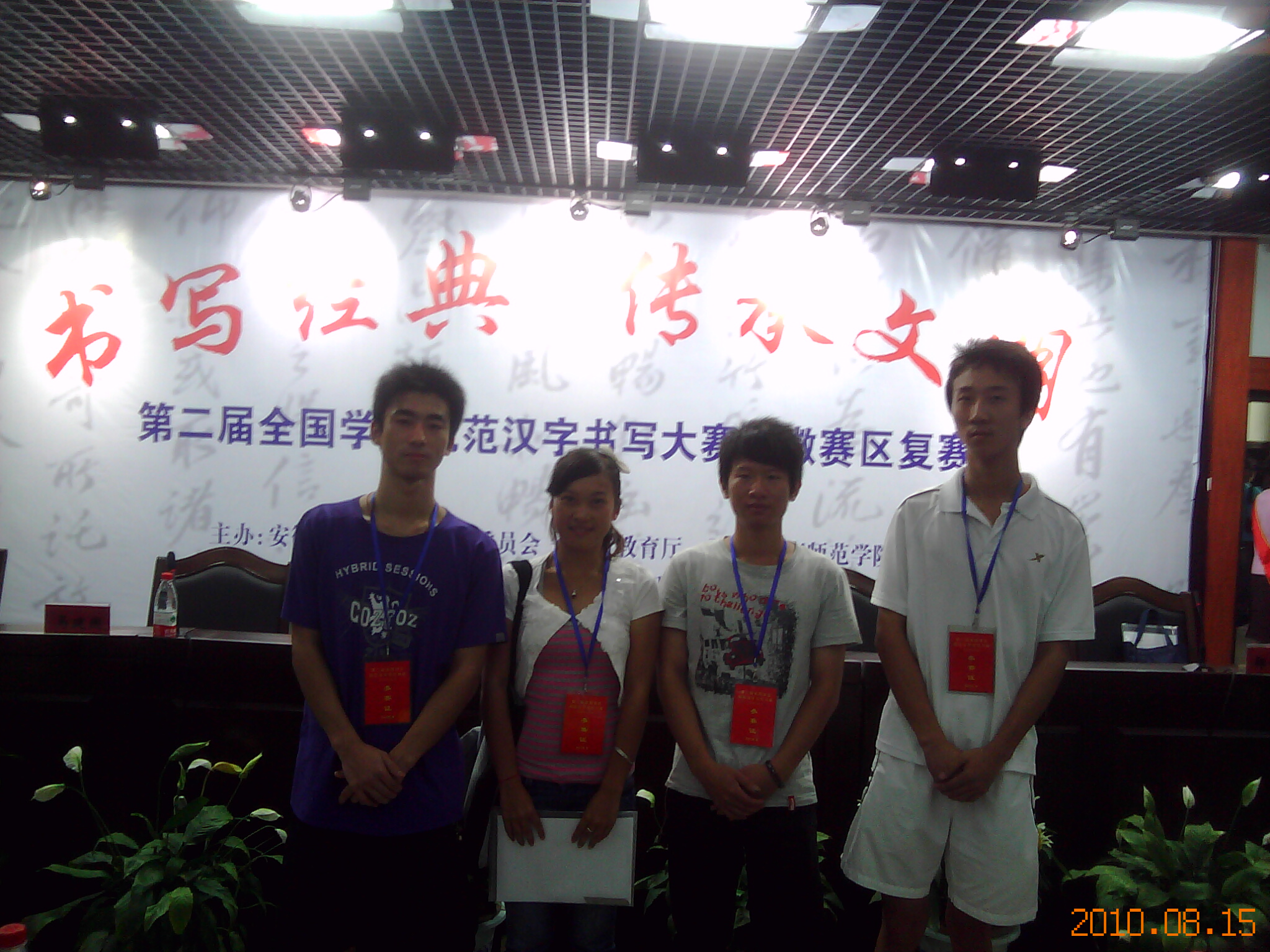 8月15日上午9时,由安徽省语言文字工作委员会、安徽省教育厅主办,淮南师范学院承办的第二届全国学生规范汉字书写大赛安徽赛区复赛正式开幕。经过初赛选拔出的、来自全省各地市、各高校的140多名选手(其中高校61名)参加了复赛。我校杨鹏、赵鸿、沈子君、陈佳佳4位同学参加了复赛。 为贯彻落实《中华人民共和国国家通用语言文字法》推行规范汉字的要求,提高学生规范汉字书写水平,引导青少年热爱祖国文字和书法艺术,继承和弘扬中华优秀传统文化,安徽省近15万名大中小学生参加了由教育部语用司发起的第二届全国学生规范汉字书写大赛。(团委)