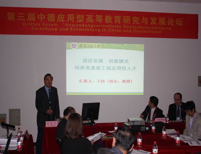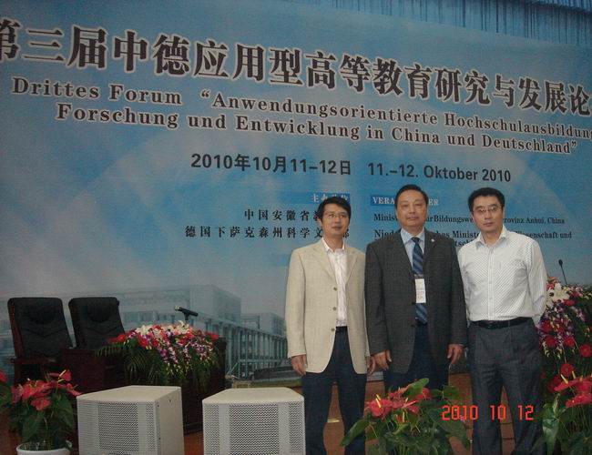 由安徽省教育厅和德国下萨克森州科技文化部联合举办,合肥学院承办的“第三届中德应用型高等教育研究与发展论坛”,于2010年10月11-12日召开。本次论坛对于了解中德应用型高等教育发展成果、推进国内外高校交流合作,具有非常重要的现实意义和积极广泛的深远影响。安徽省教育厅副厅长李和平教授、德国下州科文部部长约翰娜·婉卡教授参加了论坛并作了主题发言,原德国下州科文部发展与规划司司长卡尔-恩斯特·菲希特博士、安徽省教育厅高教处处长储常连博士作了大会总结,中外代表150余位,以及合肥学院有关领导、骨干教师100多位出席了论坛。