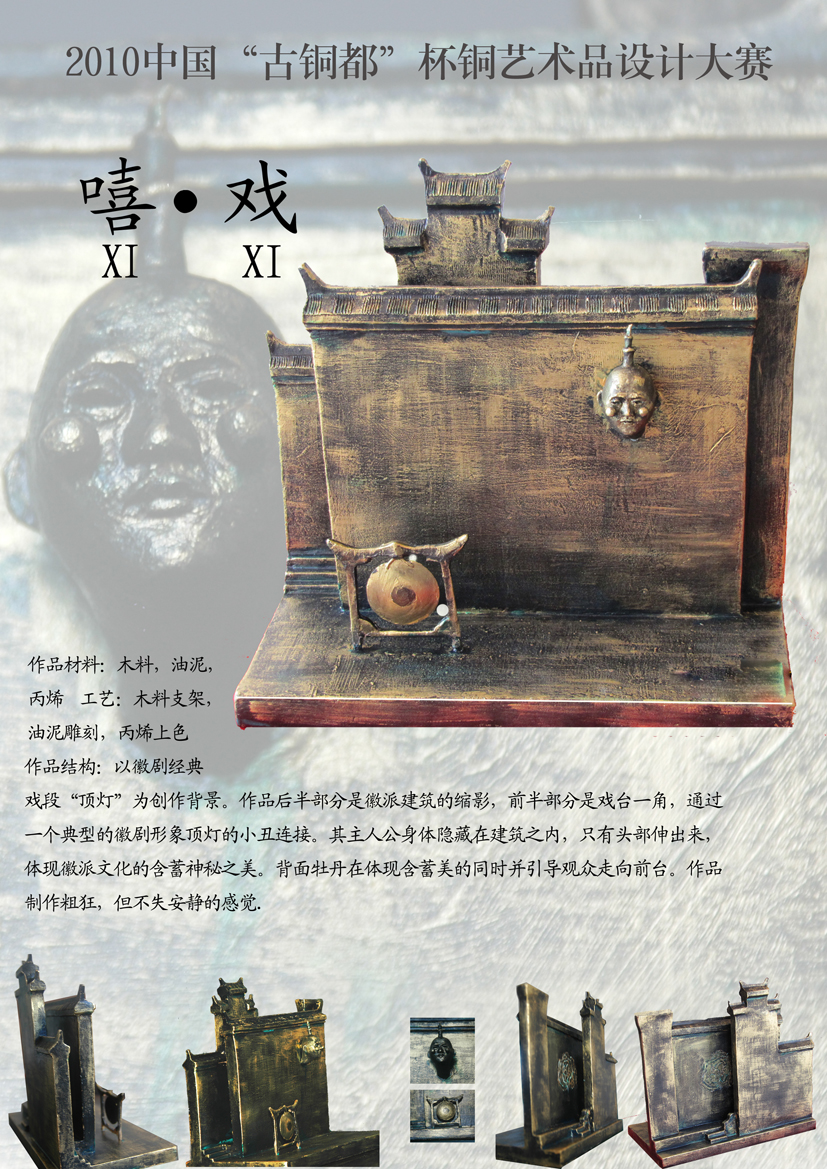 今夏7月,在获得2010第二届中国“古铜都”杯艺术品设计大赛信息后,艺术学院积极组织动员师生参加比赛,经过整整一个暑假师生的共同努力,由周红生、钱涛、王小元、张业柱、南海涛等教师指导以及参与的师生作品共获得金奖2项、银奖4项、铜奖5项、优秀奖13项,在全省乃至全国再次彰显了安徽工程大学艺术学院的组织能力和设计实力。