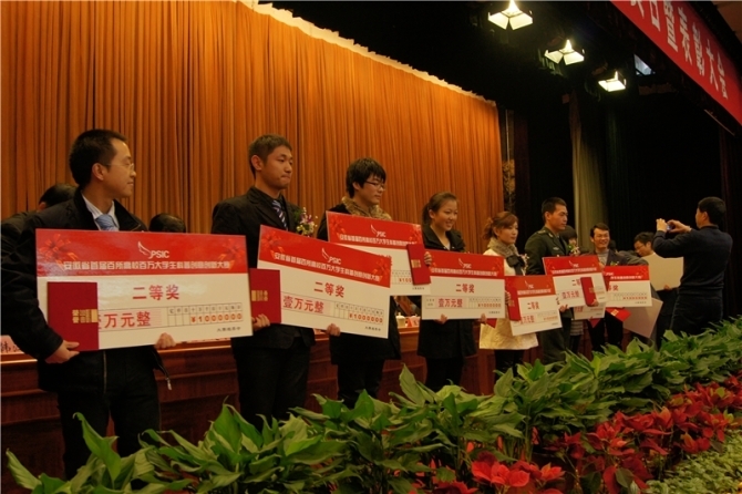 日前,由省科协、省教育厅、共青团安徽省委等共同举办的首届安徽省百所高校百万大学生科普创意创新大赛颁奖仪式在合肥稻香楼宾馆隆重举行。计算机学院孙洪宝等同学的作品《校园外传》荣获二等奖(奖金1万元),电气工程学院何群等的作品《线面形成原理显示》、电气工程学院郭多文等同学的作品《超声波避障智能车》、艺术学院汪彬彬同学的作品《“低碳生活你我行”系列海报》、艺术学院查佩仙同学的作品《今天你低碳了吗》、人文学院彭梅等同学的作品《地球来客》荣获三等奖(奖金各5000元),10个作品荣获优秀奖。学校被授予优秀组织奖,由于组织工作和获奖成绩突出,组委会还特别授予我校“优胜奖”荣誉。校团委副书记刘一、指导老师代表王冠凌及获奖选手代表参加了颁奖仪式。