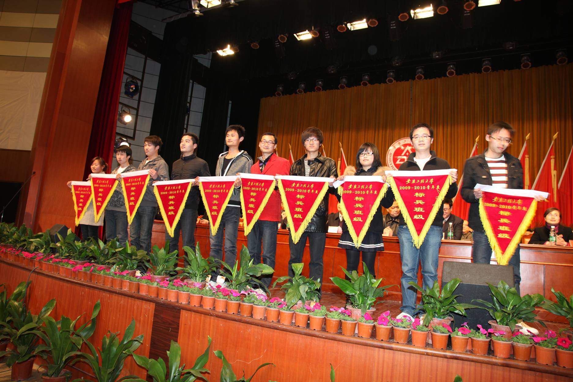 在全体起立奏国歌之后,校党委副书记、副校长方友实宣读了学校关于2009-2010学年学生工作先进学院表彰决定:授予电气工程学院、机械与汽车工程学院、计算机与信息学院、艺术学院为“学生思想教育工作先进学院”荣誉称号;授予纺织服装学院、人文学院、数理学院、电气工程学院为“学生管理工作先进学院”荣誉称号;授予外国语学院、人文学院、电气工程学院、纺织服装学院为“学风建设工作先进学院”荣誉称号;授予外国语学院、机械与汽车工程学院、生物与化学工程学院、管理工程学院为“毕业生就业工作先进学院”荣誉称号。