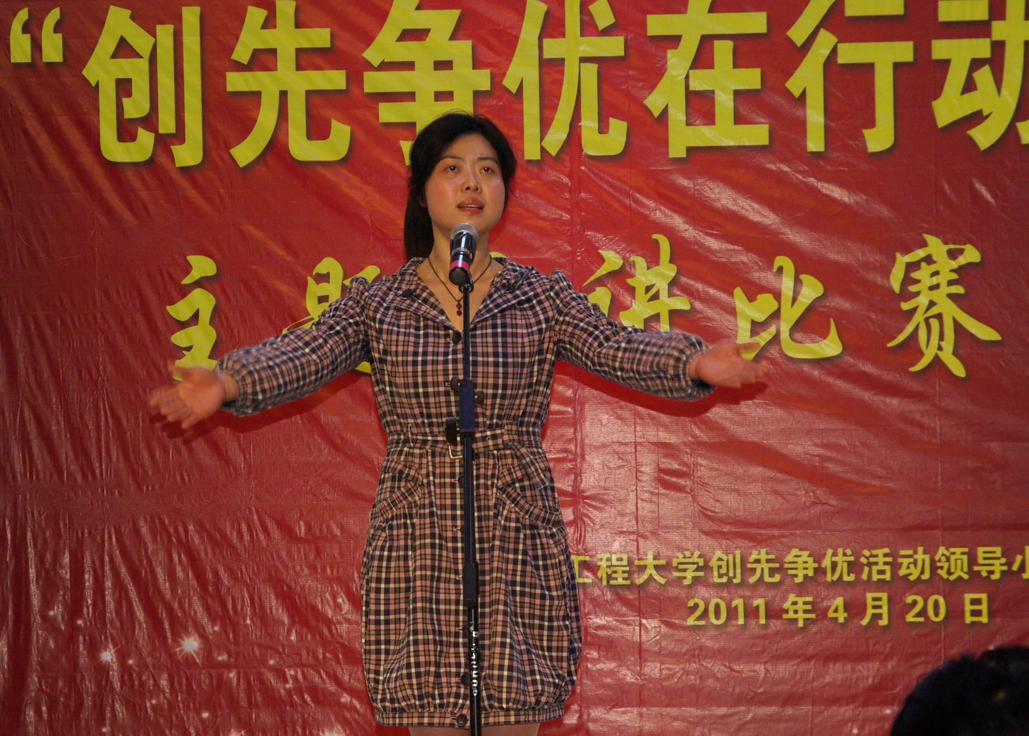 外国语学院的苏涛以“铭记入党光荣誓词,践行教师神圣职责”为题,表达了对岗位的无限忠诚和热爱;人文学院的蒋艳以饱满的热情、生动的语言阐述了新时期教师的风采;数理学院的孙明国表达了为教育事业奉献而无怨无悔的豪迈情怀;后勤总支的李四军结合后勤工作实际向大家诠释了“创先争优“是一种精神境界,是一种工作追求;体育学院的李明结合所在学院大发展中的故事指出扎实做好本职工作的重要性;机电学院的居洋用抒情柔美的语言传递了在一点一滴的行动中去践行“创先争优”活动的感悟;教辅总支的韩家勤就图书馆工作结合“创先争优”活动实质指出“只有优质的服务,没有抱怨的借口”。纺织服装学院的张艳艳对自己如何立足岗位争先进娓娓道来;管理学院的孙颖联系自己的经历,讲述了教职工成长中让人感动的点滴;机械与汽车学院的董芬为大家展示了一个恪尽职守、无私奉献的教师的光辉形象;计算机与信息学院的罗国旗决心要“在平凡的岗位做不平凡的角色”;电气工程学院的王玲玲情真意切,她呼吁各位党员要脚踏实地从身边的小事着眼,争当优秀,深深感染了在座的每一位观众;机关总支的王中江慷慨激昂地演绎了共产党员“生命的价值”,令人震撼;来自生化学院的查桂义和任一鸣的双人配乐演讲则让人耳目一新,他们激情渲染了如何在“创先争优”活动中努力做事,踏实做人,完善自我,完善工作;艺术学院的陈叶承诺愿将青春和热血奉献给太阳底下最美好的事业,不断向着新的目标前进。