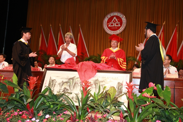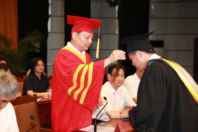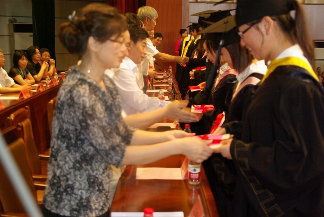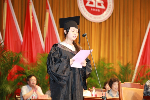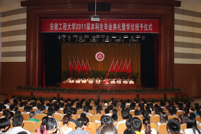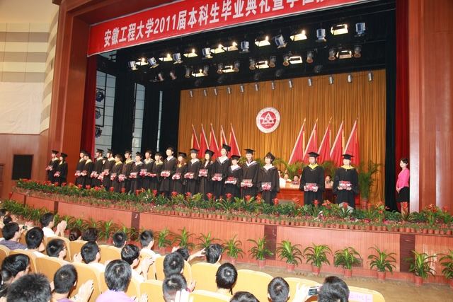 毕业典礼在庄严的国歌声中拉开帷幕。干洪校长首先代表学校党委、行政以及全体师生员工向圆满完成学业的全体同学表示热烈的祝贺,向抚育同学们成长的父母和精心培育同学们的教师表示崇高的敬意。 他说,各位同学在学校生活的这个时期,也是陪伴、见证和参与学校成长与发展的时期。在过去的四年中,学校发展步伐不断加快,办学实力显著增强,科研水平不断提升,内涵建设显著提高。学校在高素质应用型人才培养与高端科学研究及其成果转化,推动社会进步方面业已形成核心竞争力,并得到社会认可。同学们热情地关心和支持着学校的建设与发展,努力学习,全面发展,并以主人翁的姿态积极投身于本科教学评估和更名大学等各项重大改革和活动中,为学校做出了很大贡献,学校的发展始终与同学们的参与、支持和奋斗息息相关的,为此向同学们表示衷心的感谢。 他还对毕业生提出希望,希望同学们志存高远,报效祖国。在开创祖国美好未来的征程上责任重大、使命光荣,要把爱国主义作为始终高扬的光辉旗帜,以爱国报国为己任,把个人事业和祖国发展结合起来,牢记社会主义事业建设者和接班人的宏伟使命,目光远大,开拓创新,心存厚爱,奉献社会,努力成就自身的事业,献身民族的复兴;希望同学们爱岗敬业,艰苦奋斗。“创业维艰,奋斗以成”。做工作,要干一行、爱一行,爱一行、精一行,在今后的工作中,要兢兢业业,埋头苦干,用青春和热情在平凡的岗位上建功立业,用建智慧和知识谱写人生的华彩篇章。希望同学们不断学习,完善自我。大学的生活实践为同学们实现理想、成就事业奠定了一定基础,今后的岁月依旧是一所经久耐读的大学,需要继续认真学习,不断实践,努力探索。既要学习书本知识,更要勤于实践,在实践中探索新知。希望同学们走上社会后,在追求新知,成就事业的同时,努力健全人格,不断提升自我,既应渴望成功但也接受平凡,坚持宽厚与包容,学会沟通与协作。一步一个脚印,敢于创新,团结协作,兼收并蓄,不断追求,不断完善。 接着,副校长叶常林宣读了关于授予2011届毕业生学士学位的决定。干洪校长为毕业生代表颁发毕业证书和学位证书并扶正流苏。校党委副书记、副校长方友实宣读了学校2011届优秀毕业生和安徽省2011年品学兼优毕业生表彰决定。主席台前排就座的各位领导为受表彰的毕业生先进个人代表颁发了荣誉证书。 最后,生物与化学工程学院