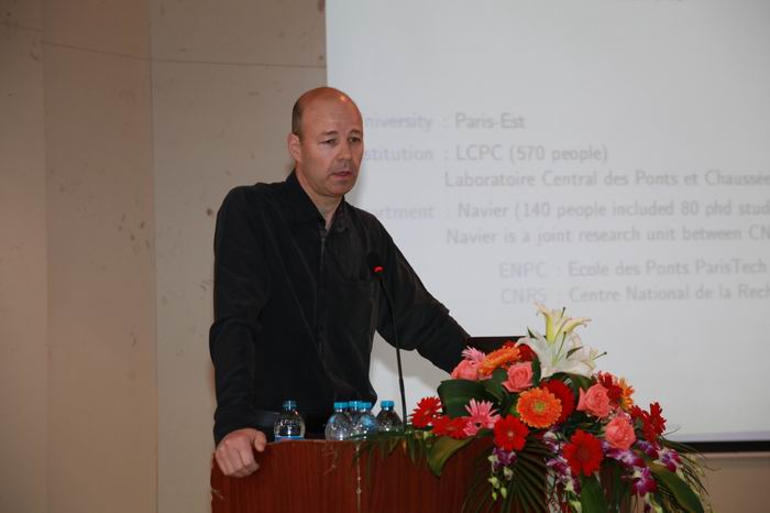 9月20日上午,Patrick Dangla教授在学术报告厅举办了一场题为“数值模拟水泥基材料物理化学过程及其耐久性”的学术报告,能容纳300余人的报告厅气氛十分热烈。Dangla教授深入浅出的讲解了水泥基材料的耐久性及其涉及到的许多诸如传输、相变、化学反映、微结构变化等物理化学机理,并指出由于水泥产品的需要,需要数值模拟手段预测水泥耐久性和评估新水泥品种的力学性能。报告结束后,Dangla教授还与现场师生进行了互动交流。