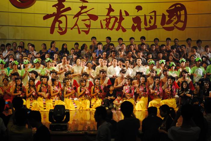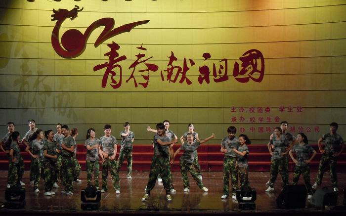 台下来自各学院的新生同学济济一堂,晚会在校大学生合唱团演唱的《我们走在大路上》拉开序幕,高亢饱满的激情,洋溢着欢乐的氛围,迅速点燃了现场观众的热情。晚会内容丰富充实,节目新颖有创意,来自全国各地的2011级新生代表献上歌舞《欢迎你,新同学》再现了新生们军训生活、破冰相识等一幕幕生活场景,带有家乡特色的表演引起许多观众的共鸣;街舞《breaking 齐舞》技艺精湛、动感十足、魅力无限;小品《一手和二手》幽默诙谐、妙趣横生;原创吉他弹唱《老师的肩膀》,以娴熟的演奏技巧、朴实无华的旋律、美妙动听的歌声,演绎了同学们对老师的崇高敬意;情景红歌师生同台表演的《松花江上》、《就义歌》反映出在光辉的革命岁月中,无数先烈用鲜血染红前进的道路,为我们点亮前方的希望,他们大无畏的革命精神依然鼓舞着我们继续前进;来自省音协西洋管乐学会的铜管五重奏《亮剑》等气势磅礴、催人奋发向上,带给我们无尽的心灵震撼;由我校学生演出的圣.桑《天鹅》,经典亘古不衰为人乐道的舞曲,把人带入一种纯洁崇高的境界,大提琴奏出旋律优美的主题,女演员专业的芭蕾舞步描绘了天鹅以高贵优雅的神情,以及对天鹅优雅而端庄型象的歌颂,打动了每位观众。嘹亮的歌声、欢快的舞蹈使晚会高潮迭起,诠释出同学们对祖国的热爱和对新同学的热烈欢迎,谱写出一曲曲、一幕幕献给祖国、献给青春的赞歌,赢得了场下观众的阵阵掌声、一致好评。最终,晚会在气势恢弘、充满民族风情的大型舞蹈《欢腾》中圆满落下帷幕。