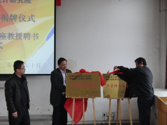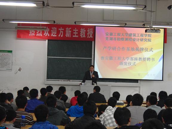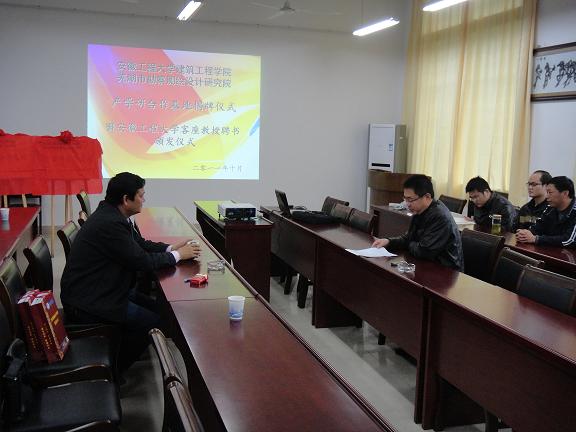 下午,校长干洪在建筑工程学院党委书记徐达奇、院长陆峰的陪同下亲切接见了芜湖市勘察测绘设计研究院院长方新主、党委书记张继才一行五人。干洪代表学校对本次产学研合作基地的落成表示热烈祝贺,随后方新主院长满怀信心地对基地的建设与发展提出了的期望。