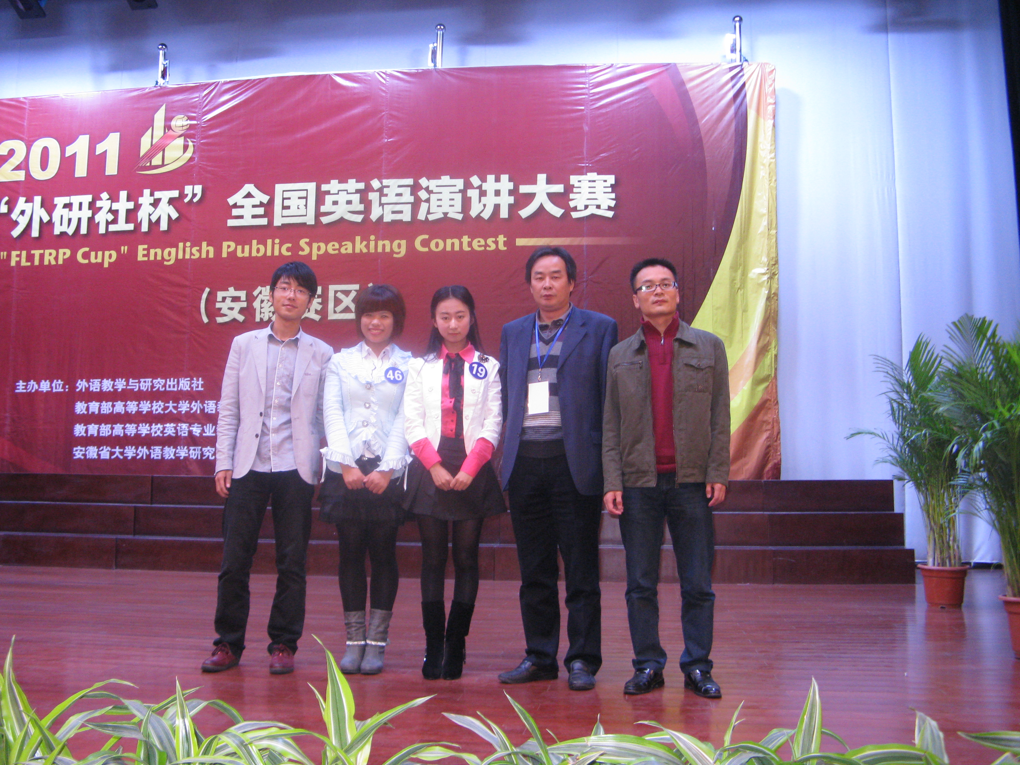 2011年“外研社杯”(原“CCTV”杯)全国大学英语演讲比赛(安徽赛区)决赛于 大赛分为复赛和决赛两个阶段,复赛包括定题演讲和回答问题,决赛分为即兴演讲、回答问题和辩论两个环节。各路选手们均做了充分的准备,竞争异常激烈和残酷。我校英语093班窦明月和蒋雅谦两位同学以纯正的语音、优雅的台风、敏捷的逻辑思维和乐观积极的精神风貌征服了评委和观众,顺利进入决赛,并在决赛阶段以良好的临场发挥以及灵活的现场应对一举拿下二等奖。同时,我校纺织083班李昂同学在大赛中也表现出色,喜获三等奖。无论从获奖人数还是获奖等级,我校均在全省高校中名列前茅,也是我校历史上在该赛事中获得的最好成绩。 外国语学院对此项比赛高度重视,在校内举行了选拔赛,通过激烈的角逐产生了3名优秀的选手参加此次决赛,赛前安排 图片说明:图1为领队金成星副院长(右2)、指导教师李新国(右1)和3名比赛选手合影。 图2为我院代表队(领队:金成星副院长;指导教师:李新国、Steve、Arash、Clare;选手:窦明月、蒋雅谦、李昂)合影。 图3为我院指导教师李新国和获奖选手窦明月、蒋雅谦在领奖台上。