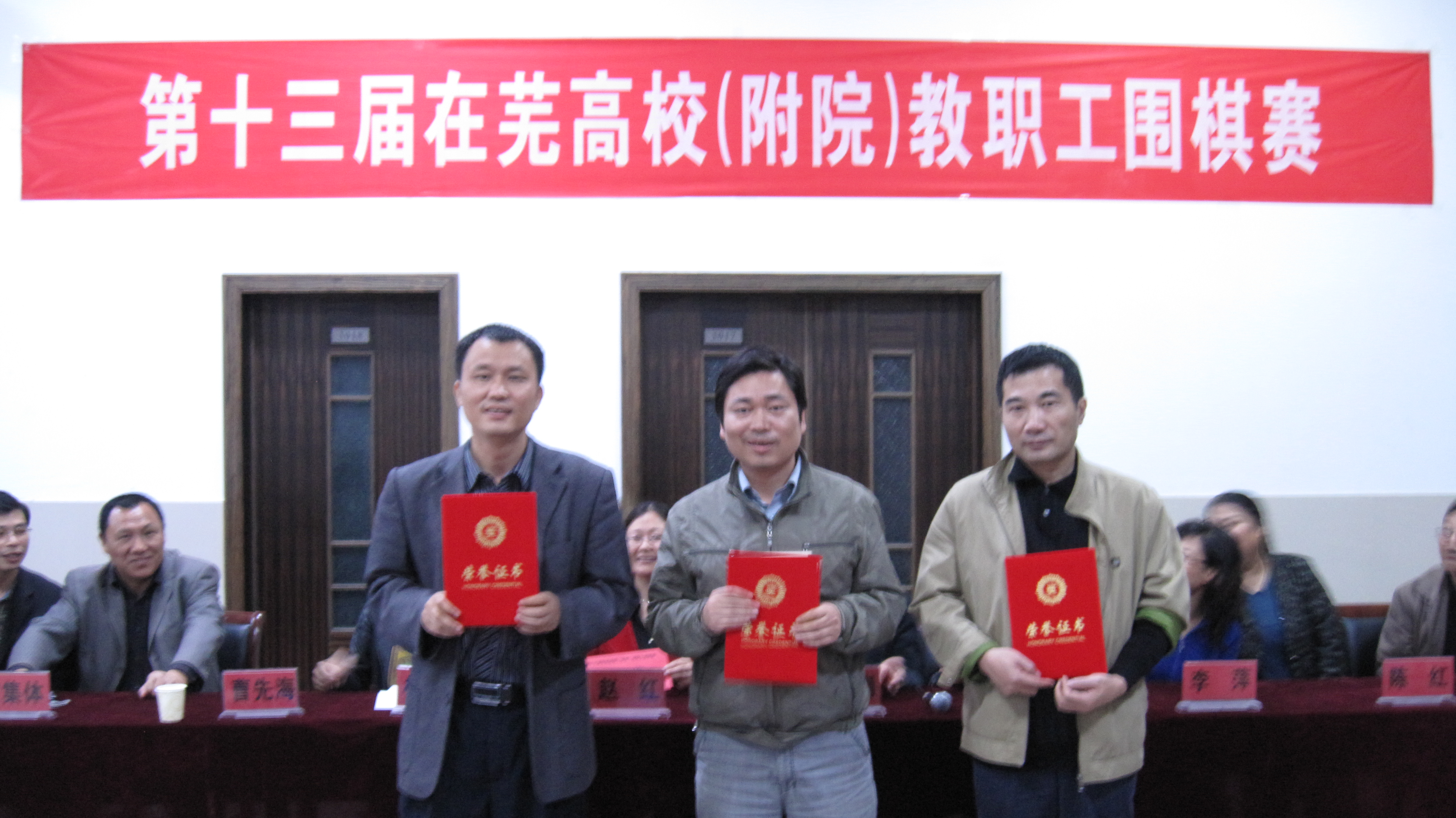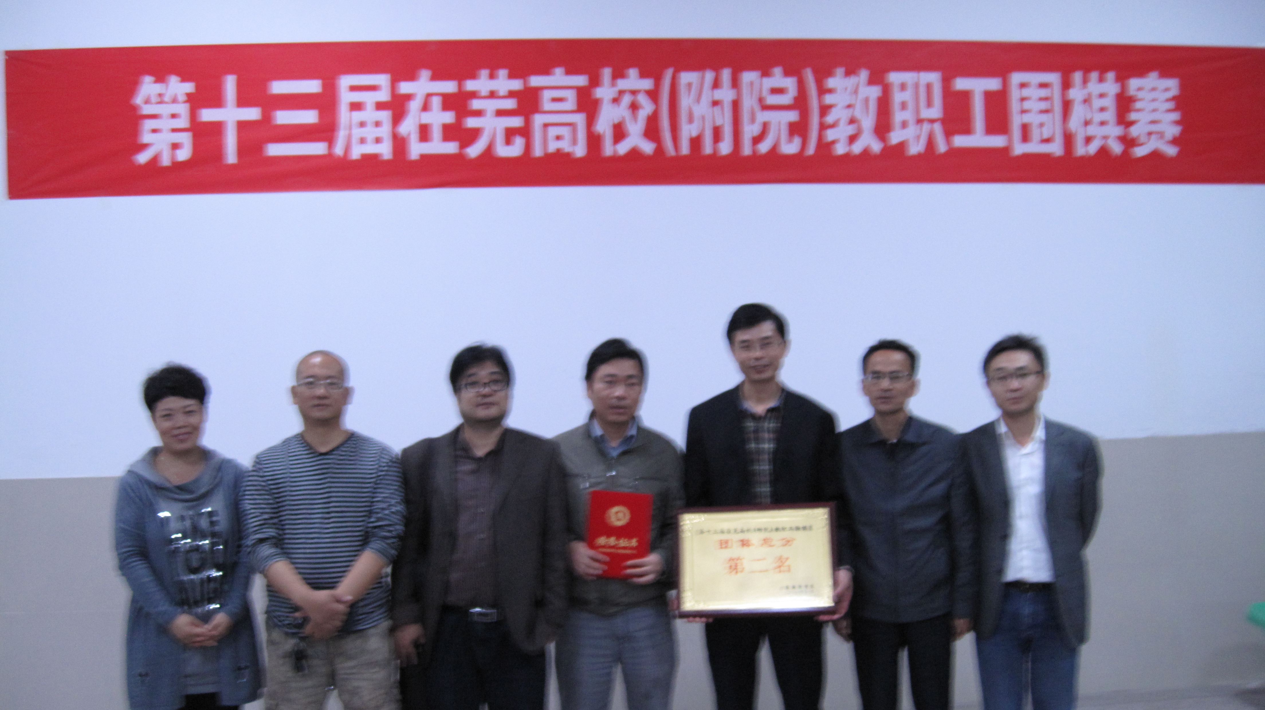 第十三届在芜高校(附院)教职工围棋赛于11月5日至6日在皖南医学院举行,共有8所在芜高校(附院)参加,我校围棋队获团体第二名,同时我校杨丹老师以全胜的战绩获个人冠军,校围棋协会负责人刘金斌老师应邀担任本次比赛的裁判长。