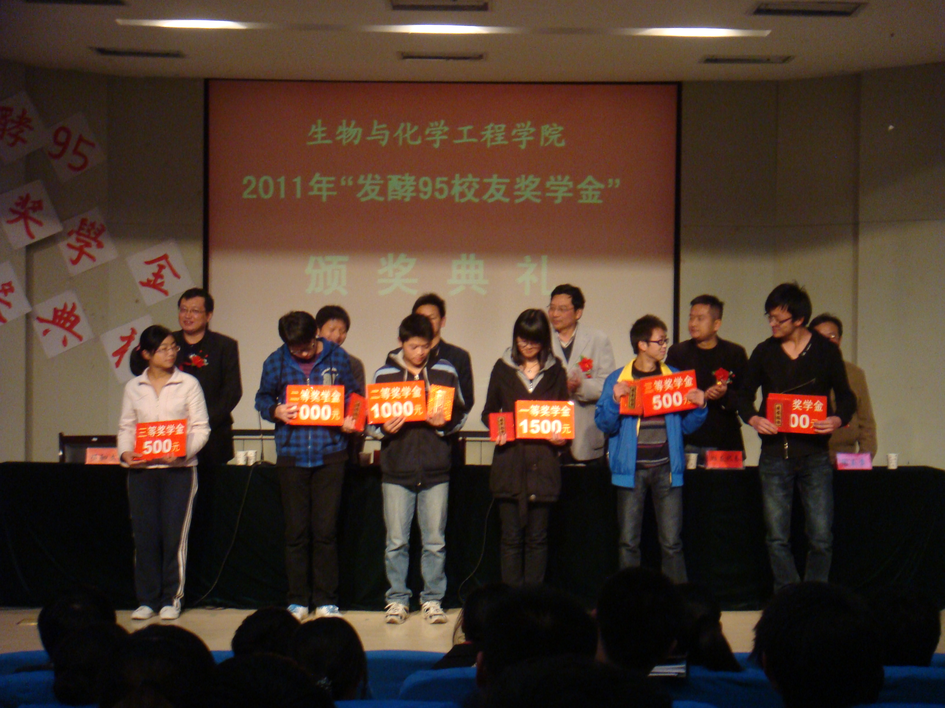 “发酵95校友奖学金”是由发酵95级校友于2009年毕业十周年同学会倡议成立,2010年10月开始实施,主要用于奖励生物工程专业品学兼优的大一学生。本年度共有六位同学获奖,其中一等奖1名,奖金1500元/人;二等奖2名,奖金1000元/人;三等奖3名,奖金500元/人。