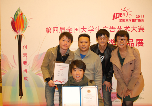 艺术学院广告学系程瑶老师,环艺系张慎成老师,带领广告学系10级学生李政、张琴波、马振皎三名学生,代表学院参加了颁奖典礼。