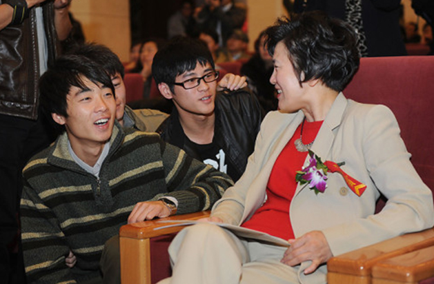(获奖学生张琴波、李政、马振皎与可口可乐大中华区可持续发展总监陈旭晶女士愉快交谈)