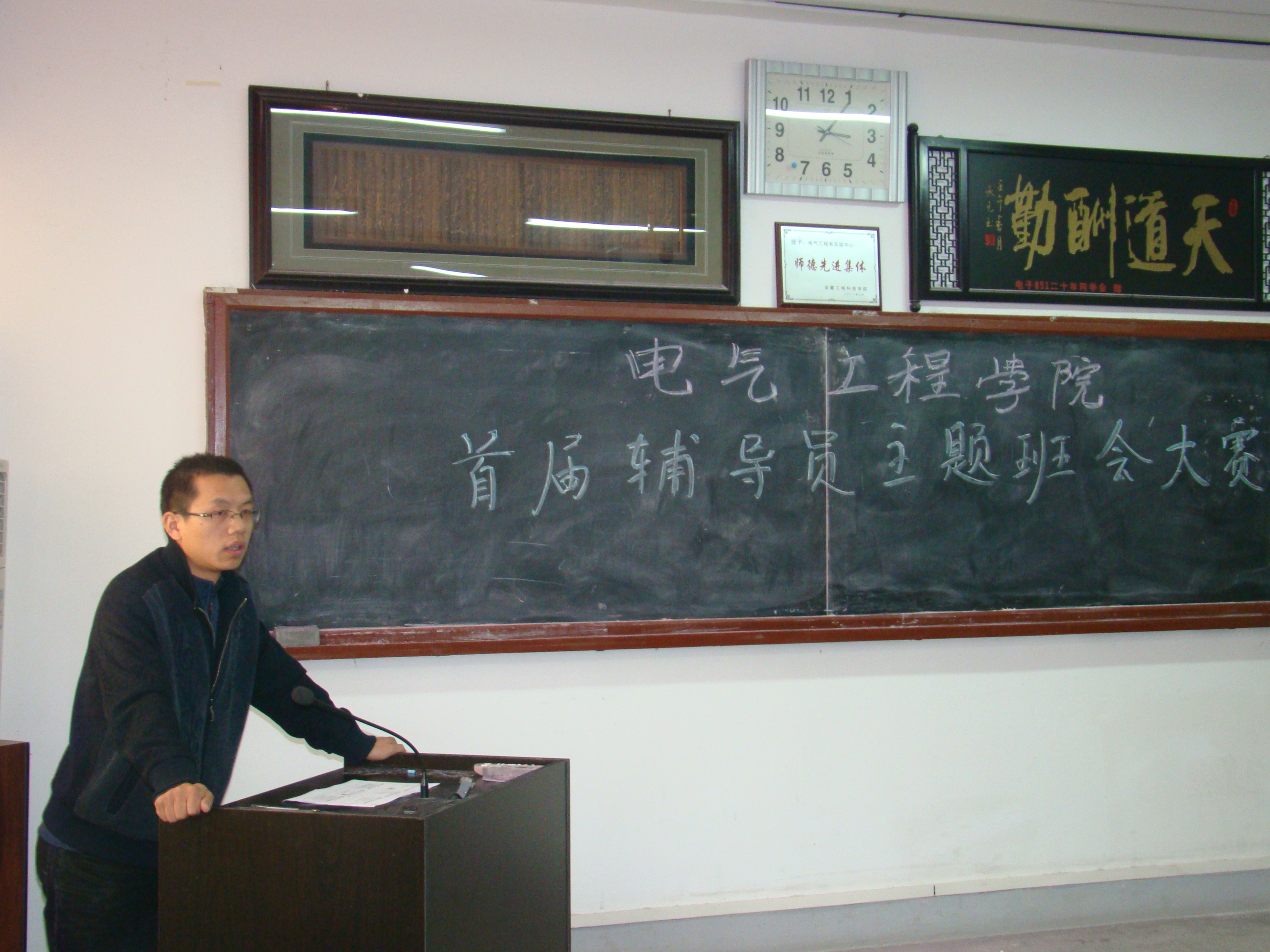 电气工程学院七位辅导员根据学生日常工作生活实际,结合各班学生特点,以“感恩教育”、“心理健康教育”、“遵纪守法、文明礼仪教育”、“大学生人际关系”、 “大学生涯设计”、“冬季消防安全教育”和“文化素质教育”为主题分别进行了20分钟左右的班会展示。各辅导员以精心的设计方案、丰富的教育素材、亲切的情景设计、激昂的演讲技巧展示出一堂堂生动的班会,给人亲临其境之感。经与会人员评比,比赛选拔蔡金平和朱洪浪两位同志代表电气工程学院参加学校的辅导员主题班会决赛。