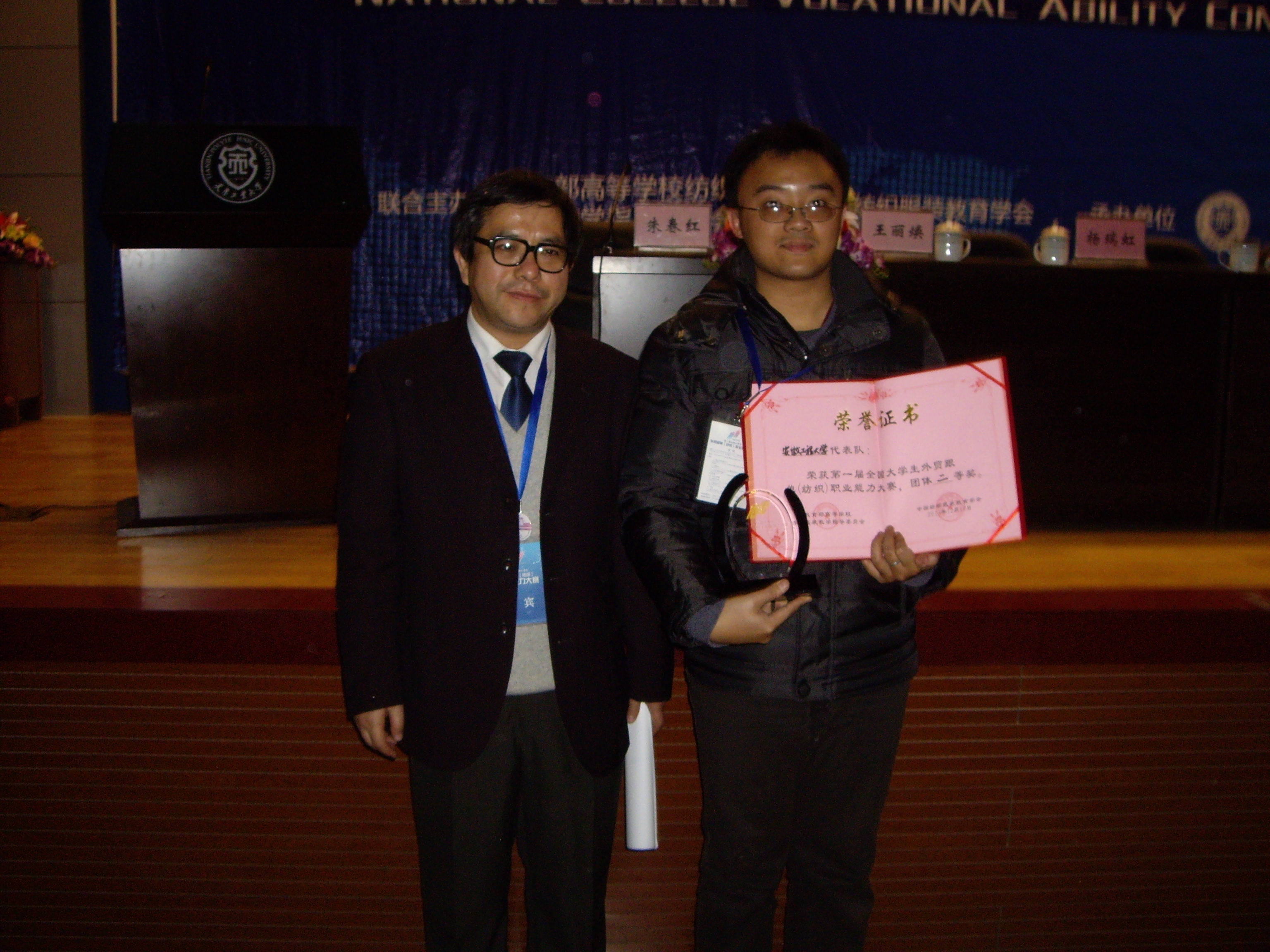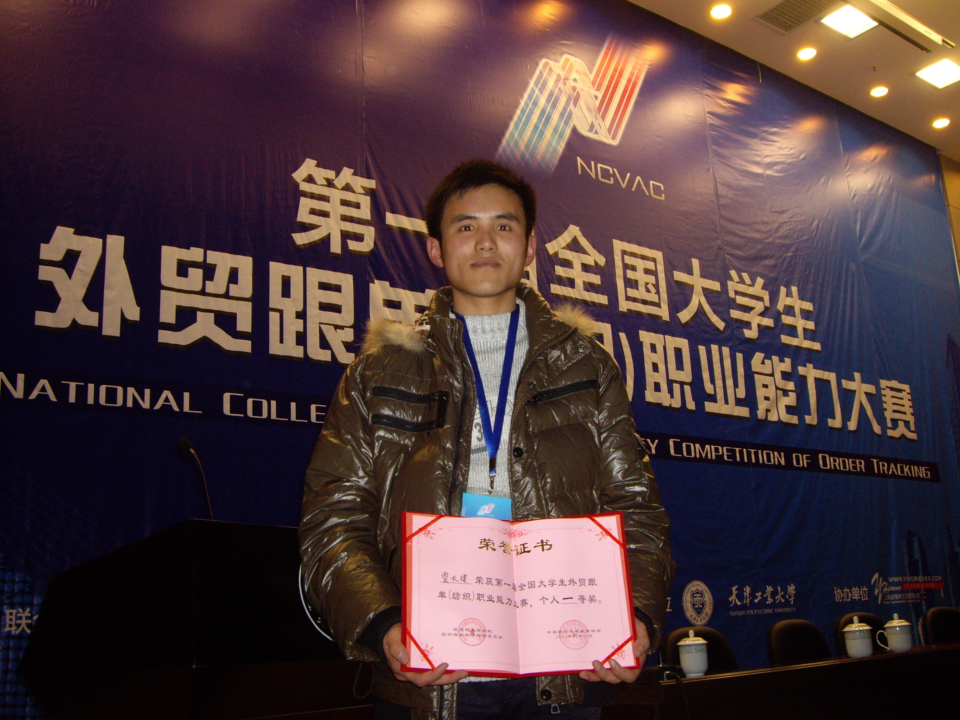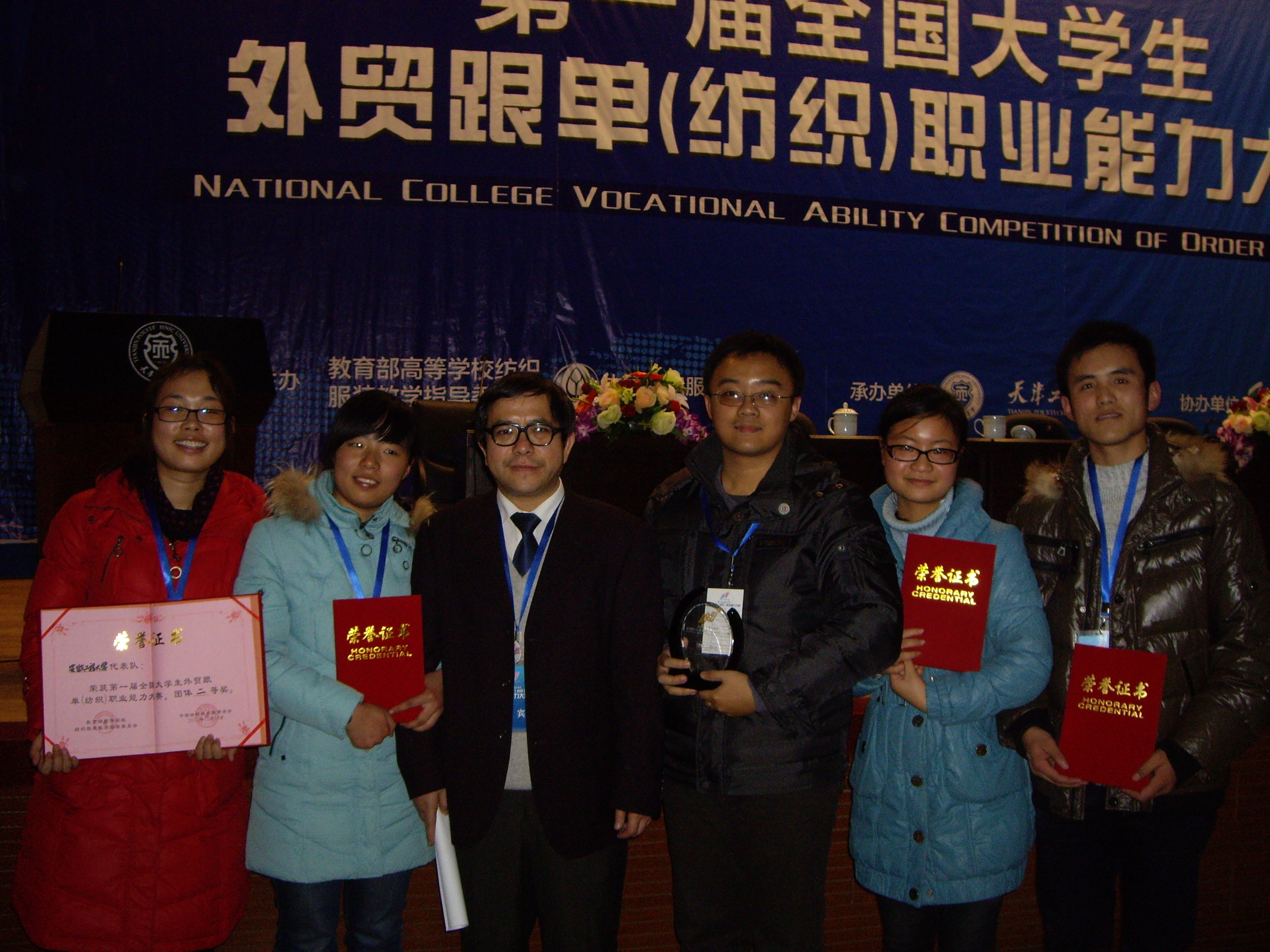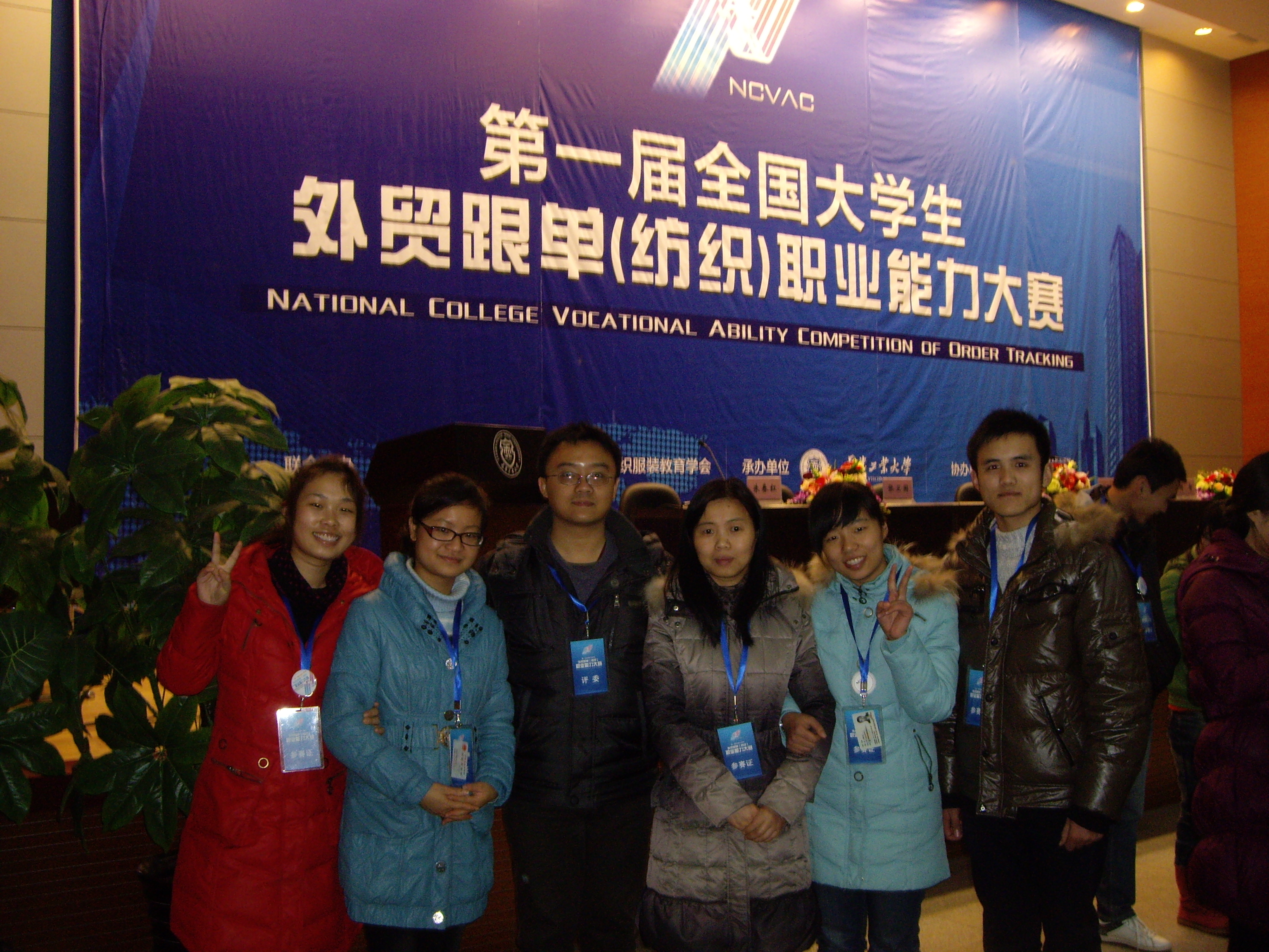 2011年12月9日至11日,第一届全国大学生外贸跟单(纺织)职业能力大赛在天津工业大学举行,我校纺织服装学院纺织工程09级贾长建、服装设计与工程(工)09级支欢欢、王琪、毛永娟四位同学组成的代表队在王竹君和孙玉芳老师的带领下参加了比赛。