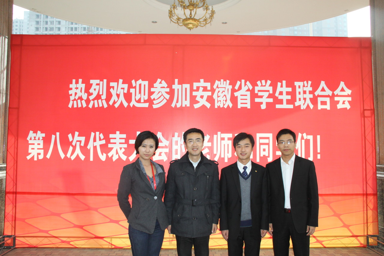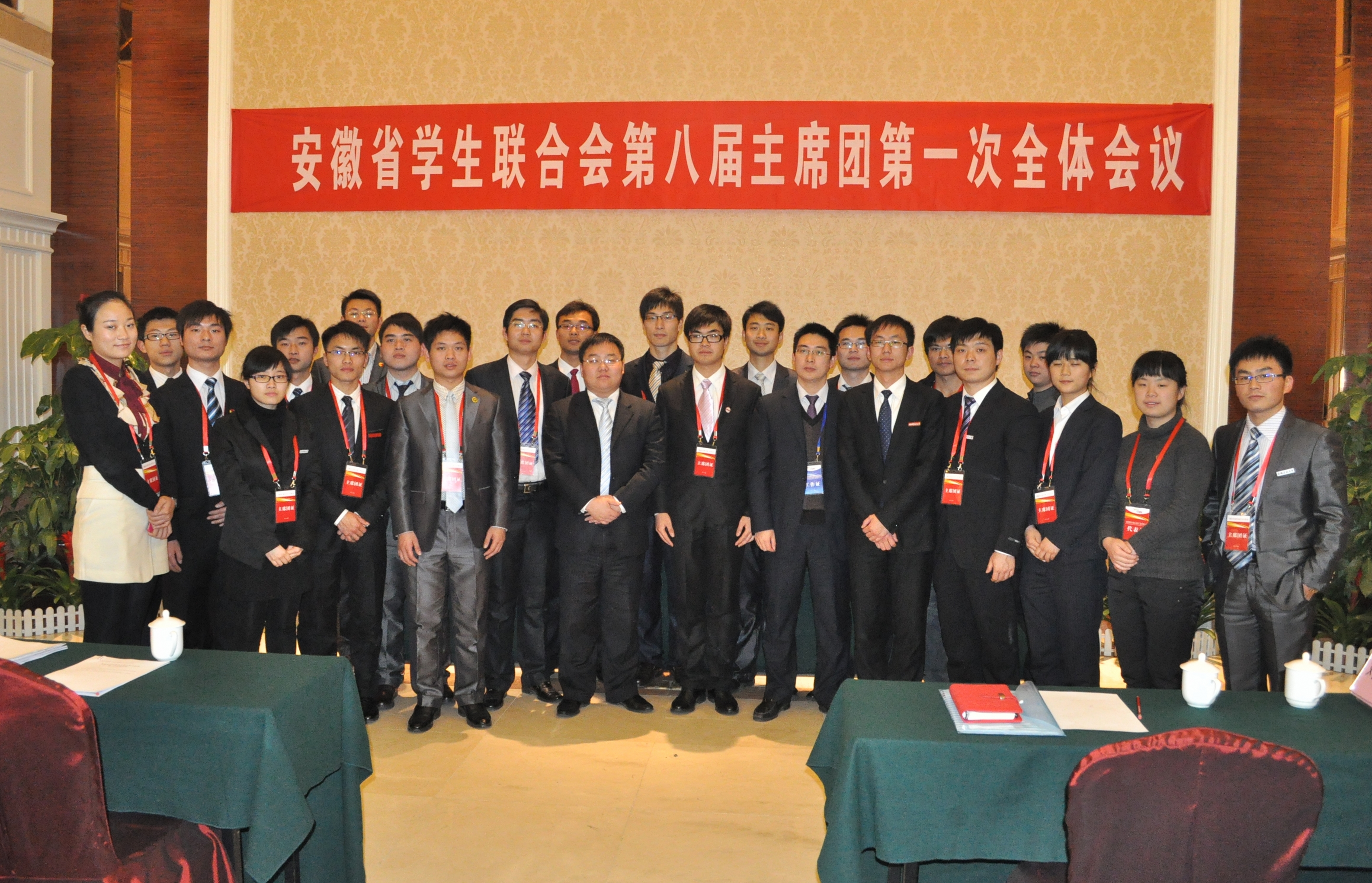 安徽省学生联合会第八次代表大会及安徽省青年联合会第十届委员会全体会议于2011年12月12日至14日在合肥召开,我校省学联八大列席代表:校团委书记刘一,省学联八大正式代表:校学生会原主席徐双全、校学生会原主席助理何妍霏、纺织服装学院学生会原主席王威,省青联十届委员、艺术学院副教授丁薇出席会议。