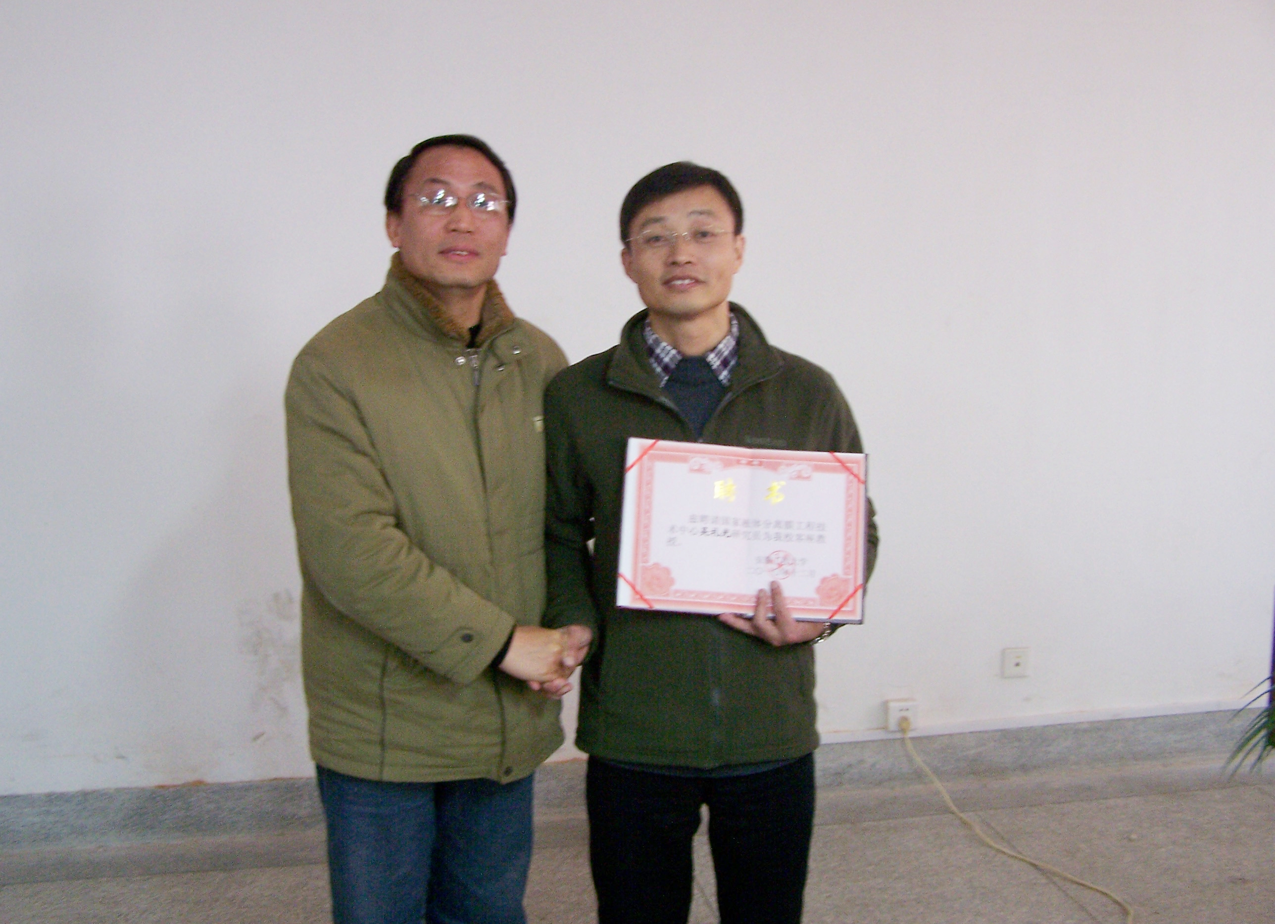 吴礼光研究员被我校聘请为客座教授,校党委副书记、副校长方友实为吴礼光研究员颁发聘书,生物与化学工程学院党委书记王弘参加聘任仪式。