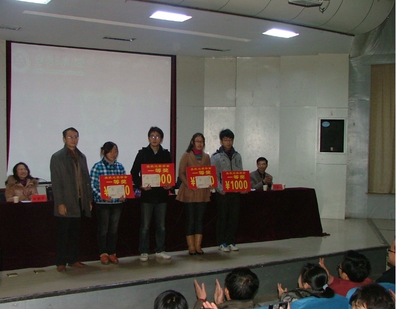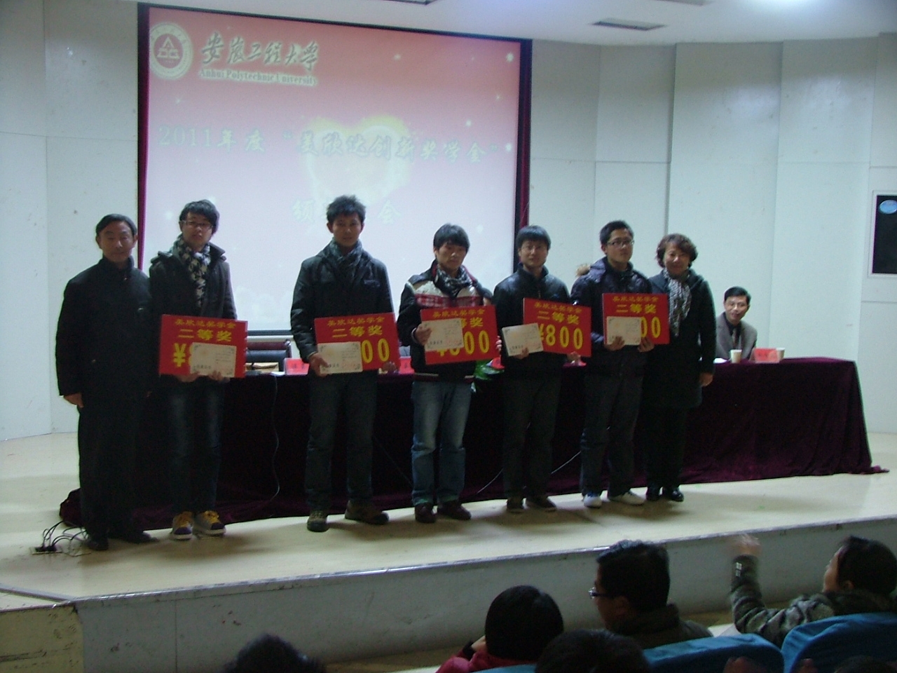 颁奖大会上,首先由获奖学生代表向浙江美欣达印染集团股份有限公司的嘉宾敬献鲜花。胡家增宣读了《关于安徽工程大学2011年“美欣达”创新奖学金评比结果的通报》的文件。在欢快的乐曲中,主席台上就座的领导和嘉宾为获奖同学颁奖。王河、余新霞、汪玉明、宋安庆分别在会上讲话。王河从“祝贺”、“感谢”、“感恩”、“担当”四个方面作了热情洋溢的讲话,他祝贺同学们通过勤奋努力获得奖学金,感谢企业支持学校高素质创新型人才的培养,鼓励获奖同学要学会感恩,回报社会,并以此次获奖为契机,在创建优良学风建设中担当责任、发挥表率作用,号召广大同学要向获奖同学看齐,力争上游,争取获得奖学金。余新霞和汪玉明分别代表各自学院对浙江美欣达印染集团股份有限公司关心我校学生成长、大力支持高等教育事业表示由衷的感谢。宋安庆代表公司对我校教育事业的发展表示热烈的祝贺,希望进一步提升校企合作关系,加强交流,争取互利双赢。最后,获奖学生代表轻化工程081班蒋鑫平、英语092班沈朋朋也在大会上发言。大会简短、热烈,在一片掌声中结束。