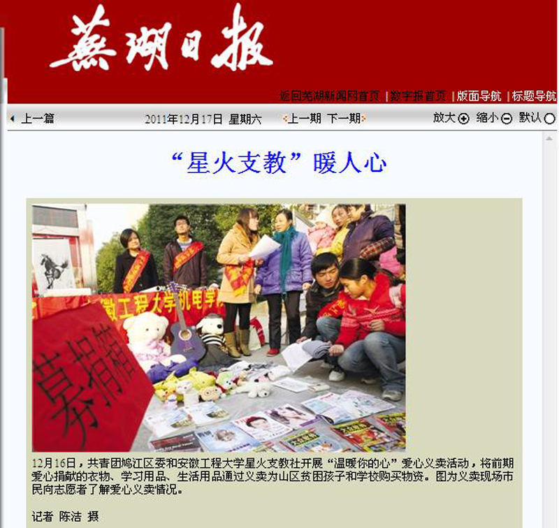 12月17日,《芜湖日报》报到了机电学院星火支教社和共青团鸠江区委在鸠兹家苑开展的“温暖你的心”爱心义卖活动。