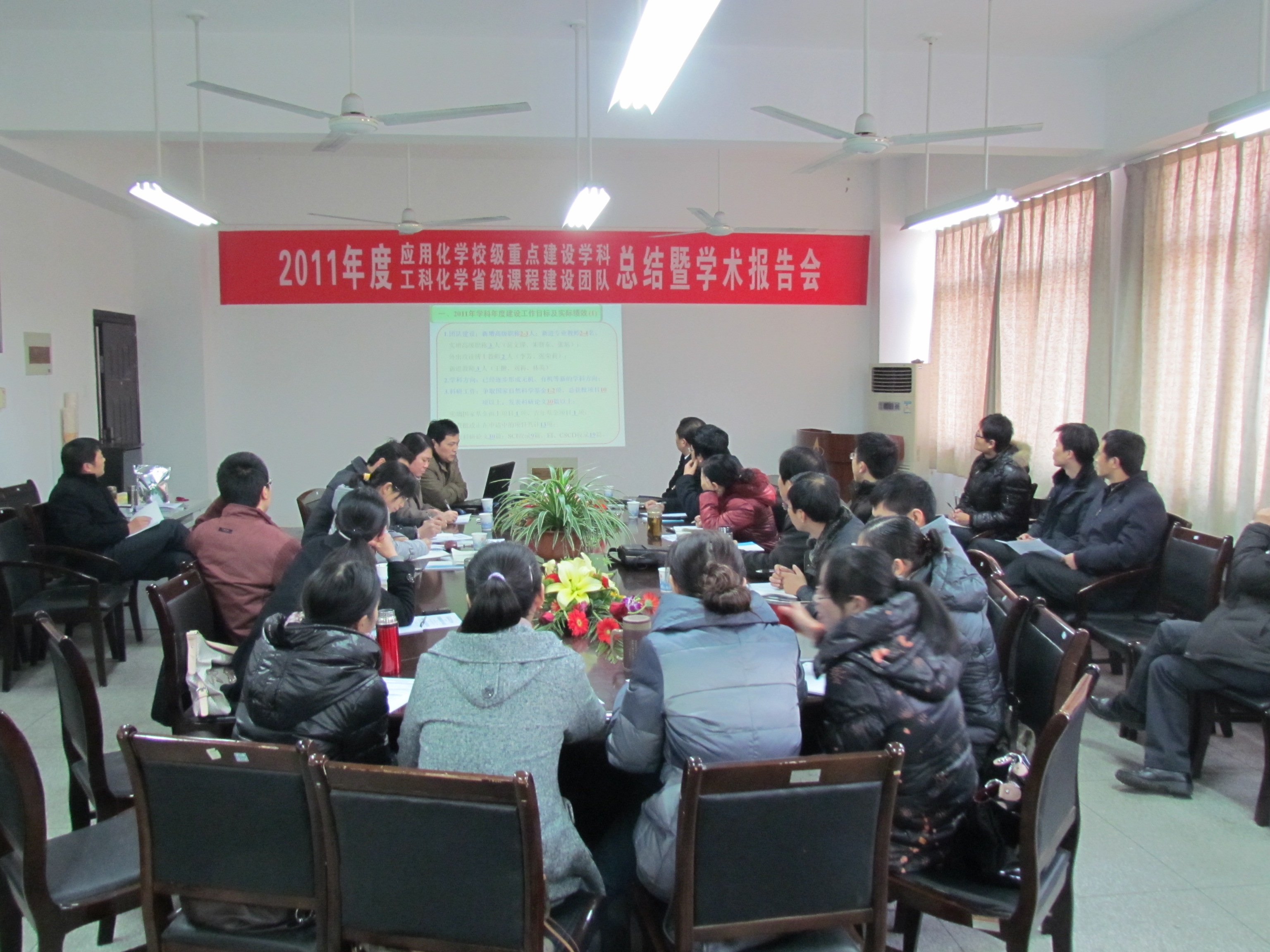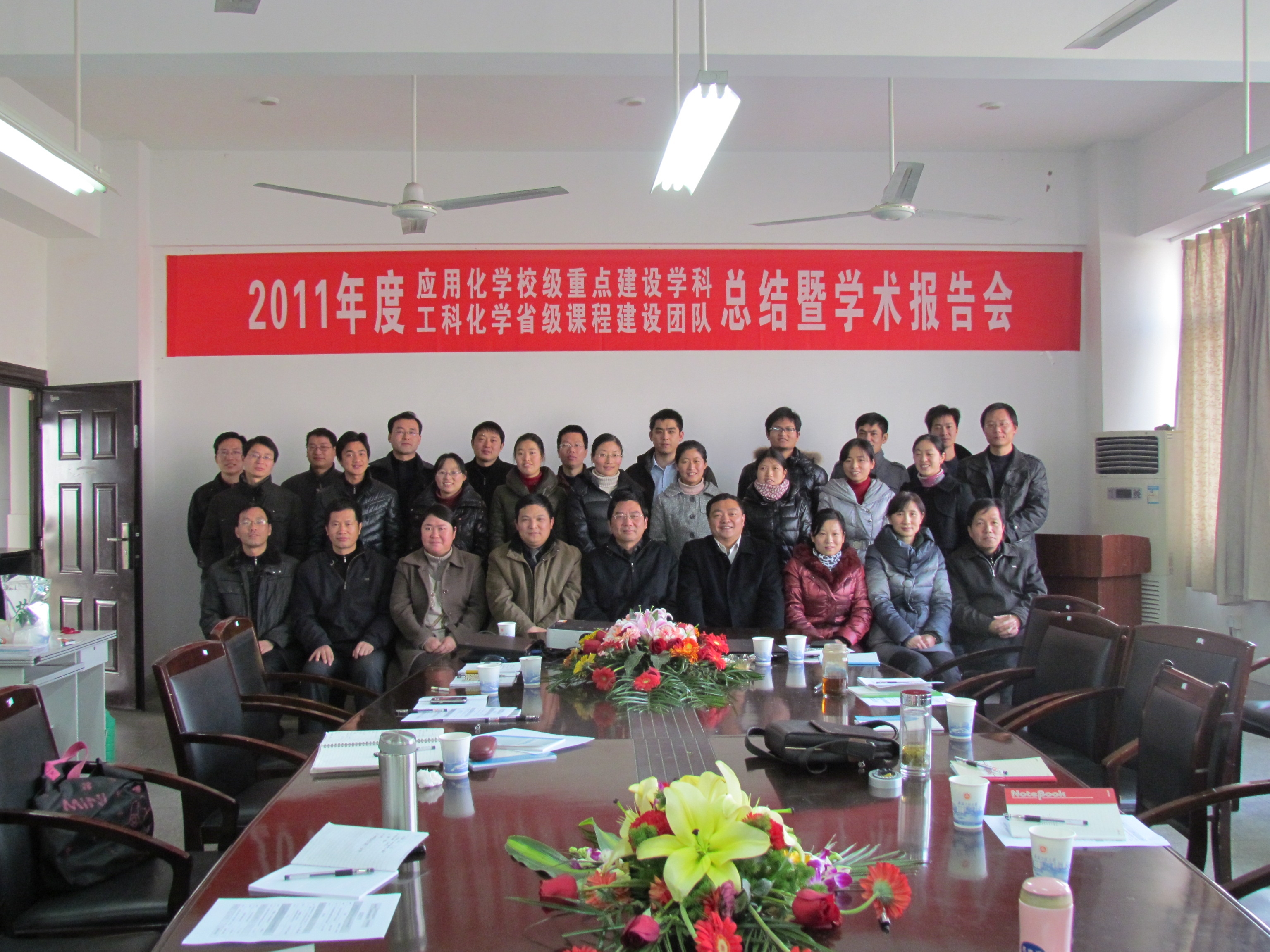 2011年12月24日,生化学院应用化学校级重点建设学科和工科化学课程建设省级教学团队2011年度总结会议在学院四楼会议室举行,学科及团队的全体教师参加了会议。院党委书记王弘、院长徐建平教授、副院长薛正莲教授、院党委副书记章兵出席会议并进行了点评和指导,会议由高分子教研室主任高建纲副教授主持。