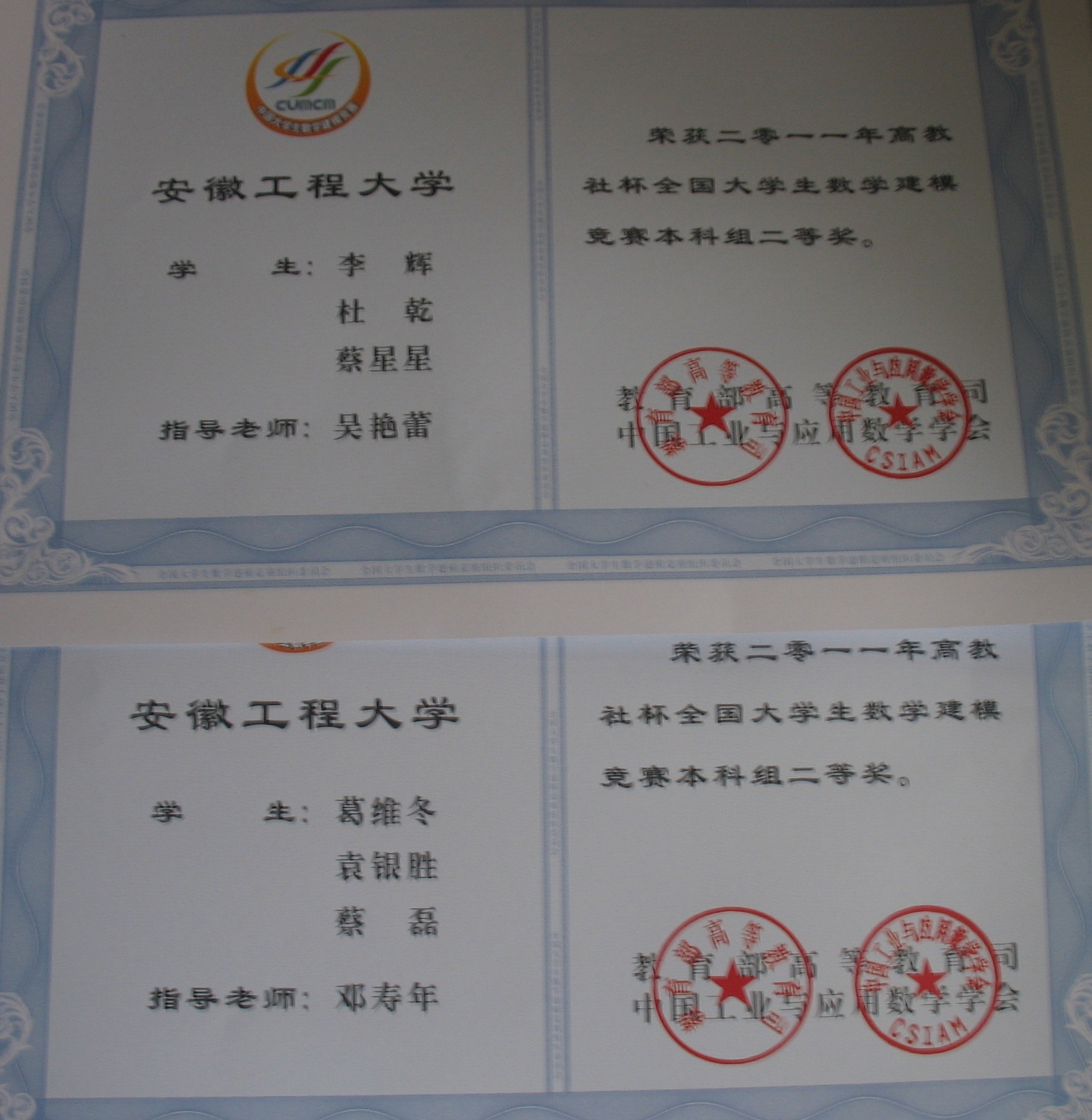 2011年全国大学生数学建模竞赛已落下帷幕。来自全国33个省、市、自治区(包括香港和澳门特区)及新加坡、美国、伊朗的1251所院校、19490个队,58000多名大学生报名参加此次竞赛。今年我校共组织17个队参加此项赛事。经安徽赛区网上函评、现场答辩,再经过全国组委会最终论文评阅等严格认真的审核,最终我校学生共获得全国二等奖2队,安徽一等奖4队,二等奖5队,三等奖4队,成功参赛奖4队的优异成绩,获奖率100%。其中省级三等奖以上的获奖率,名列安徽省前列,位于中国科技大学、合肥工业大学、安徽大学、安徽师范大学之上。