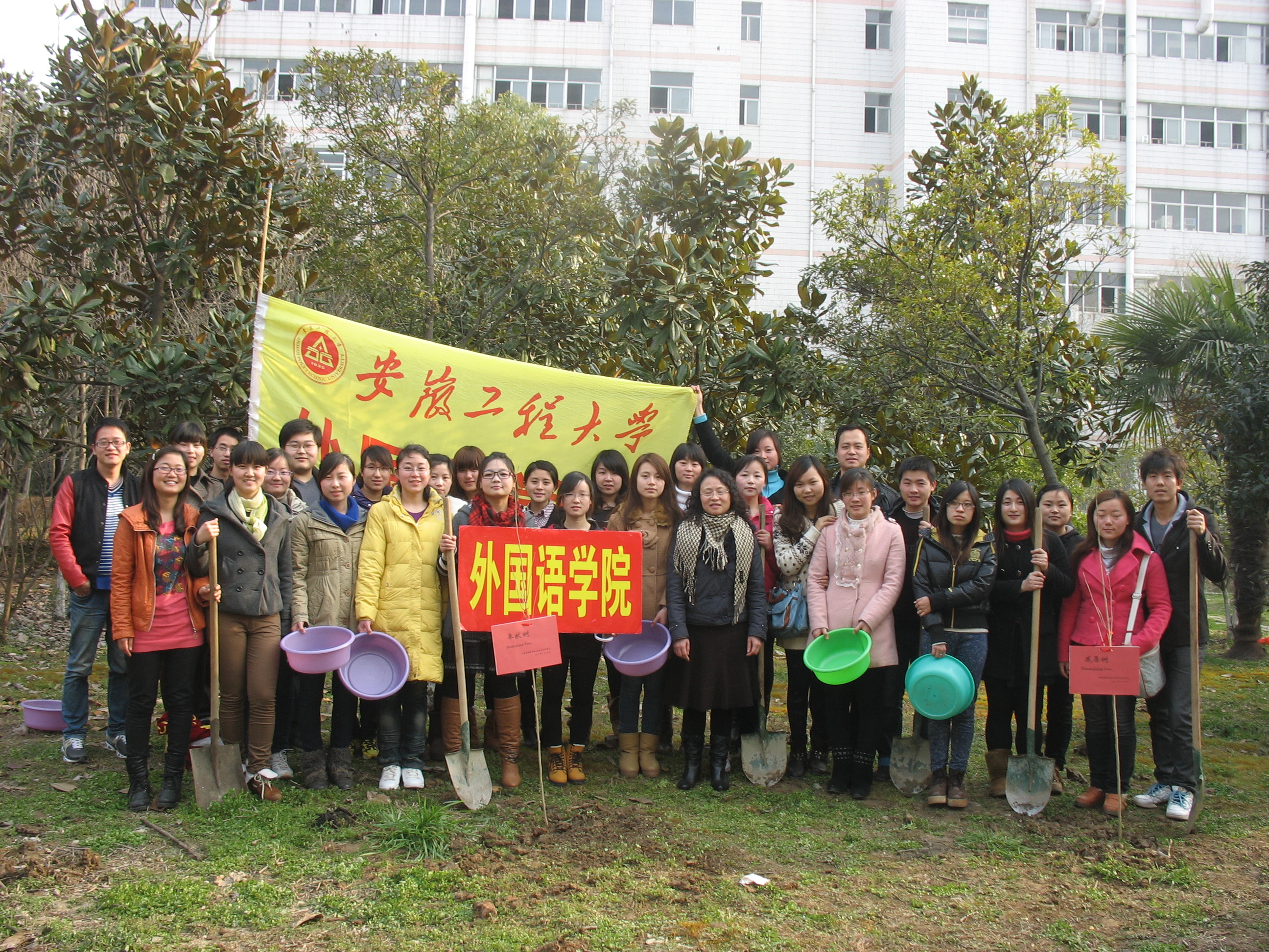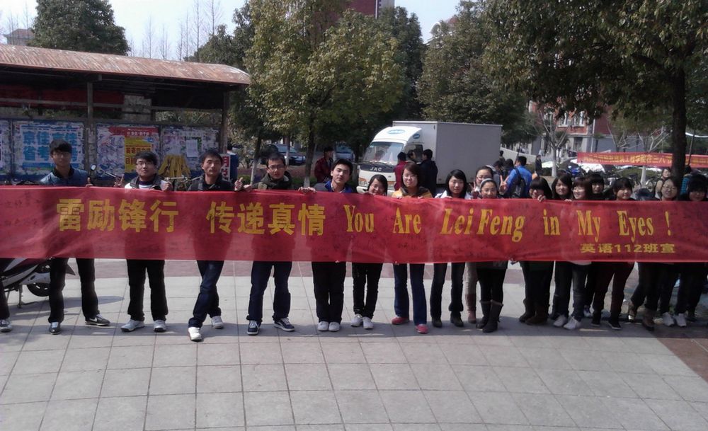3月14日下午,毕业班党小组开展了“弘扬雷锋精神,提倡低碳环保,感恩母校培育”的植树活动。同学们带着铁锹、水盆等工具,种植了由他们自己买回并命名为“奉献树(Dedication Tree)”、“和谐树(Harmony Tree)”、“感恩树(Thanksgiving Tree)”的枇杷树苗。经过同学们的辛勤劳动,当三棵树苗伫立在美丽的校园中,同学们纷纷宣誓:在今后的学习、生活和工作中要心怀感恩,将雷锋精神传承下去,牢记党员身份,发挥先锋模范作用,做好本职工作,锐意进取,自强不息,并将这种精神带入五湖四海带入工作岗位,像种下的树苗一样不断生根发芽、开花结果。3月13日至14日,英语112班开展了《雷励锋行,传递真情》主题实践活动。她们在校园里进行了“雷励锋行,传递真情,You Are LeiFeng in My Eyes!”的主题签名活动,倡导大家弘扬雷锋精神,争做雷锋传人!(校团委 外国语学院)