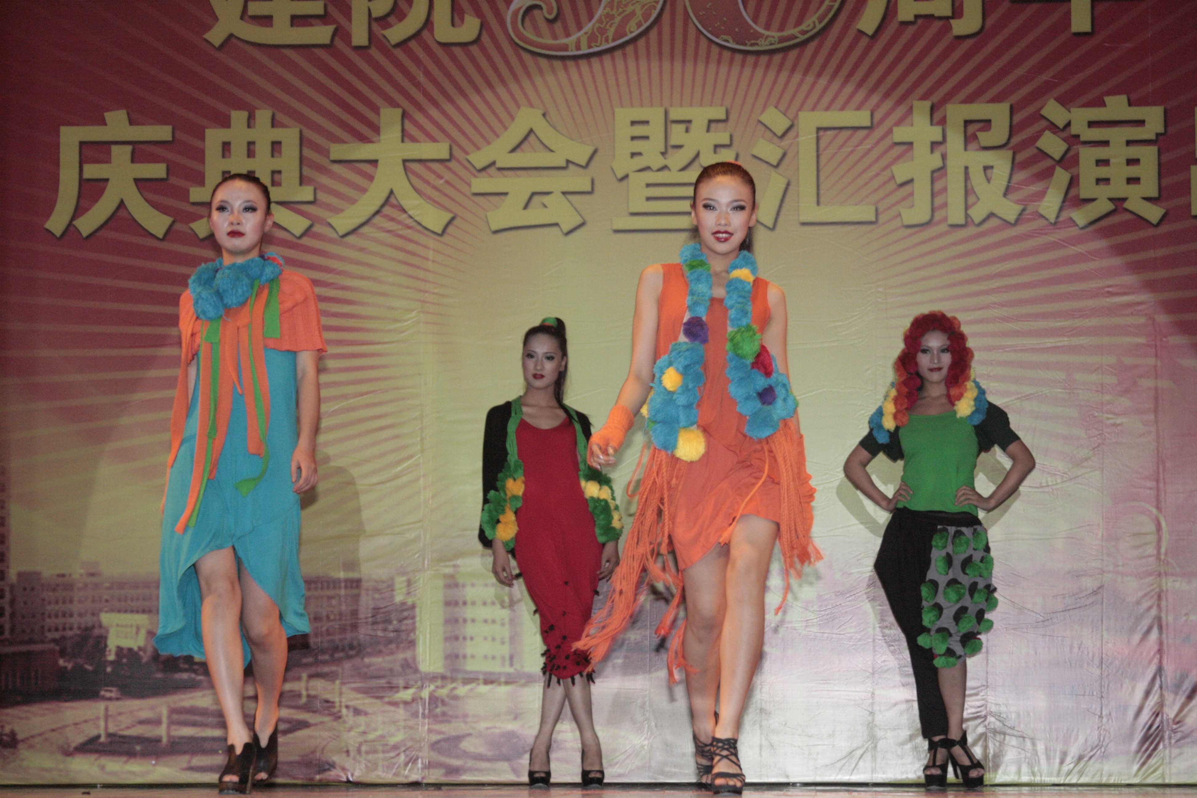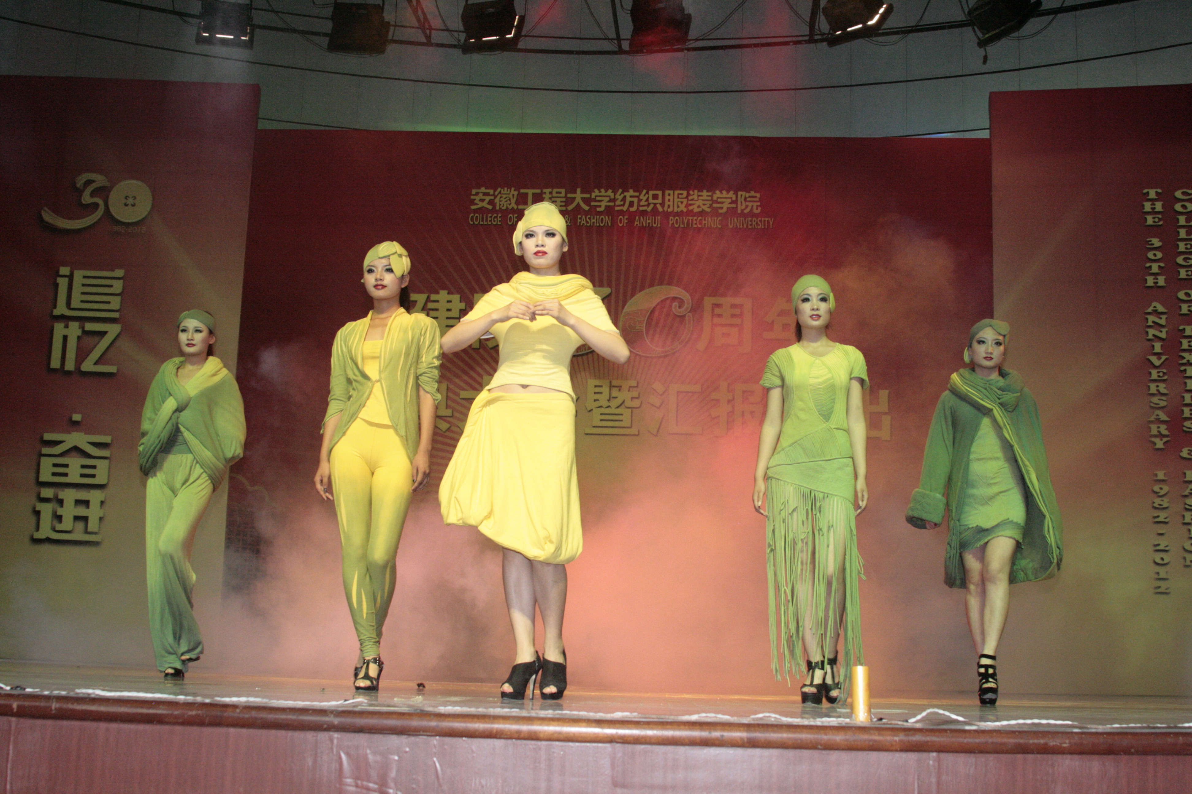 紧接着,建院三十周年汇报演出正式开始。本次汇报演出以2012届服装设计与工程专业毕业生设计作品进行服装表演为主,别出“新”裁、写意生活、华夏之风、职场丽人、璀璨明珠等五个篇章作品的演绎,主题鲜明,创意独特,充分展示了学生扎实的专业基础和良好的综合素质。本次汇报演出还特别邀请了我院校友代表的作品参演,校友们的精彩作品让观众大饱眼福,在褪尽青涩、走向成熟的过程中,校友们在社会上取得的优异成绩不仅反映了学院较强的人才培养水平,也激励着在校学生努力学习,奋发向上。整场汇报演出中,每个篇章之间都穿插着精彩的文艺节目,有原创歌曲《腾飞的凤凰》、民族舞蹈《心跳火把节》、体育舞蹈《跳动的音符》、舞蹈《年年有余》和原创吉他表演唱《老师的肩膀》,在校学生的激情表演赢得阵阵掌声,使得观众心潮激荡。