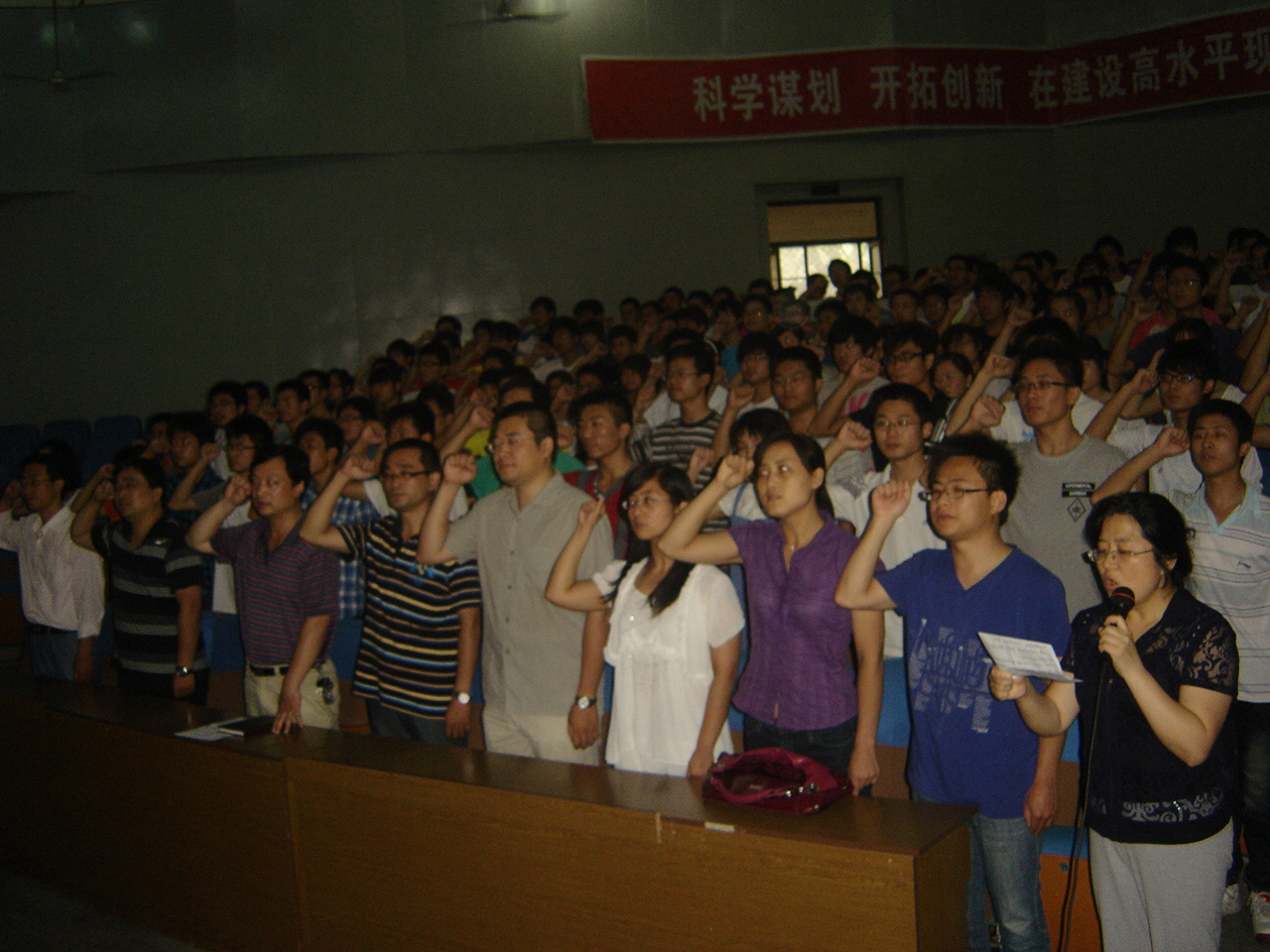 庄严的国际歌拉开了会议的序幕。首先,周怡宣布大会开始,并带领预备党员、正式党员宣读和重温入党誓词。一百多名党员有序地报出自己宣誓人的名字,铿锵有力的声音下跳动着一颗颗对党热衷而赤诚的心。然后,邓英扣作了题为“创先争优,保持党的纯洁性,迎接党的十八大”的讲话。在对新加入党组织的预备党员表示祝贺后,他带领全体同学一起回顾了党的历史、党的成就以及近年来党的建设与发展,肯定了党的先进性。紧接着,分别从“创先争优,积极发挥‘五带头’作用”、“锐意进取,全面发展,当好社会主义事业的建设者和接班人”两方面阐述了作为学生党员应培养和具备的素质,通过理论联系实际的论述方式,对当下大学生之间出现的不正当思想进行了纠正,激励了同学们争当优秀党员的决心。最后,周怡宣布会议结束。