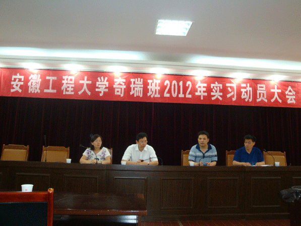 陶庭先首先做了重要讲话。他指出,奇瑞班是我校与奇瑞公司在大众化教育背景下办学模式的探索和创新,2011年成立以来,经过1年的理论学习,现已进入实践教学环节阶段。陶庭先指出,实践教学是高校人才培养过程中贯穿始终、不可缺少的重要组成部分,是提高人才培养质量的重要环节,是培养学生实践能力和创新能力的主要方法和手段,是巩固学科知识、训练科研素养、培养理论联系实际作风的重要途径。加强实践教学工作,是经济社会发展对人才培养提出的客观要求,是我国高等教育更深层次改革与发展的内在要求,是实现多样化人才培养目标的迫切需要。陶庭先对奇瑞班同学提了三点要求:一要要珍惜实习机会,把理论知识与实践相结合,善于发现问题,总结问题,做好实习报告;二要在实习过程中要把安全放在首位,严格遵守实习场所的规章制度,服从实习指导教师的指导和安排。三要建立定期汇报制度,构建良好的信息交流平台。