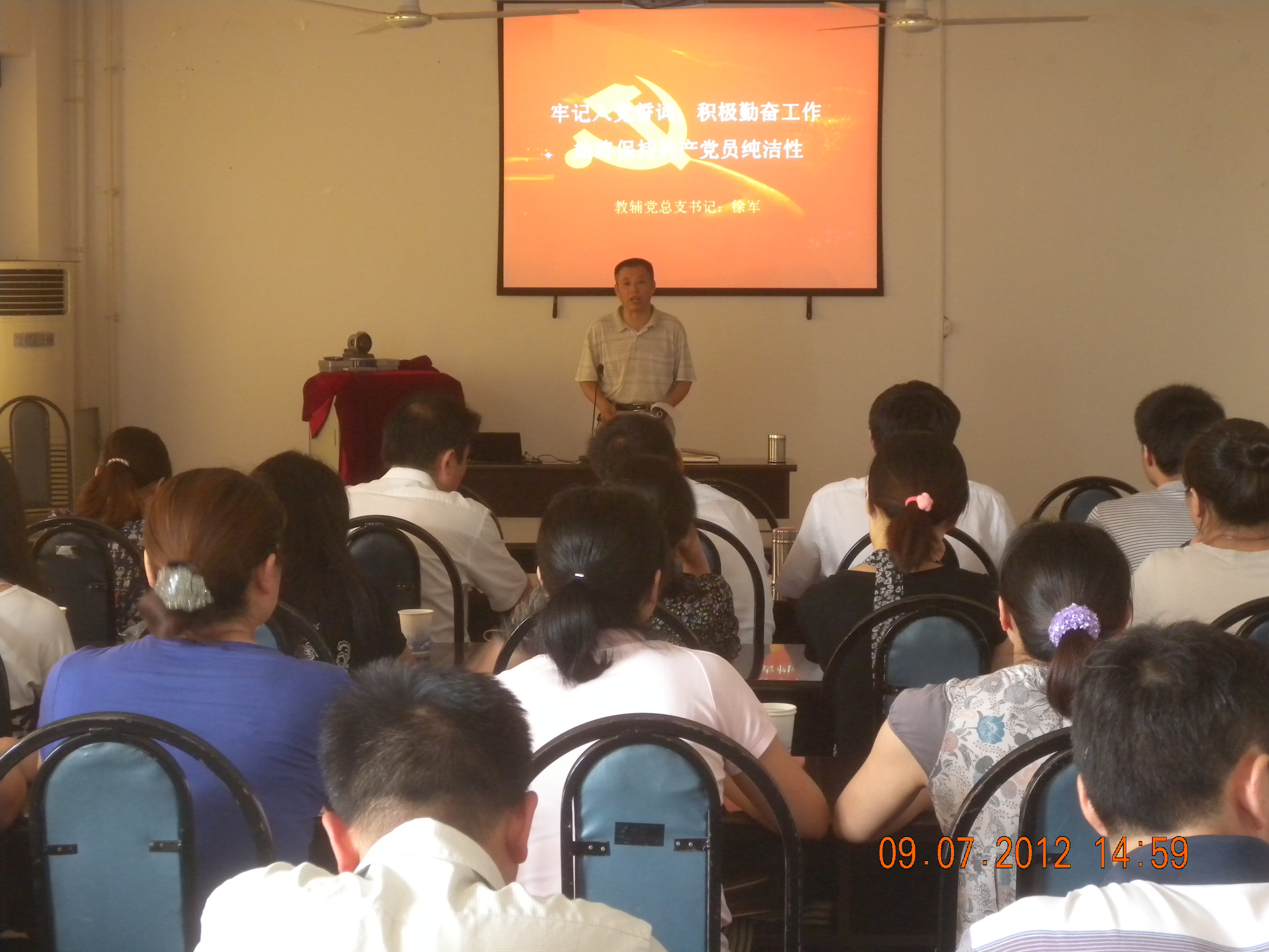 近日,教辅党总支召开全体党员大会,大会主要内容包括表彰优秀基层党支部、优秀党员,对“保持党的纯洁性,迎接党的十八大”主题教育实践活动作再动员,总支书记徐军讲党课。