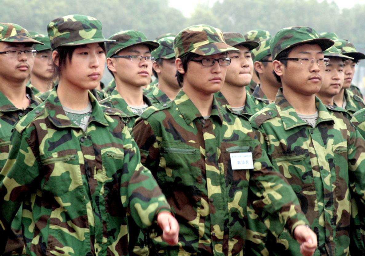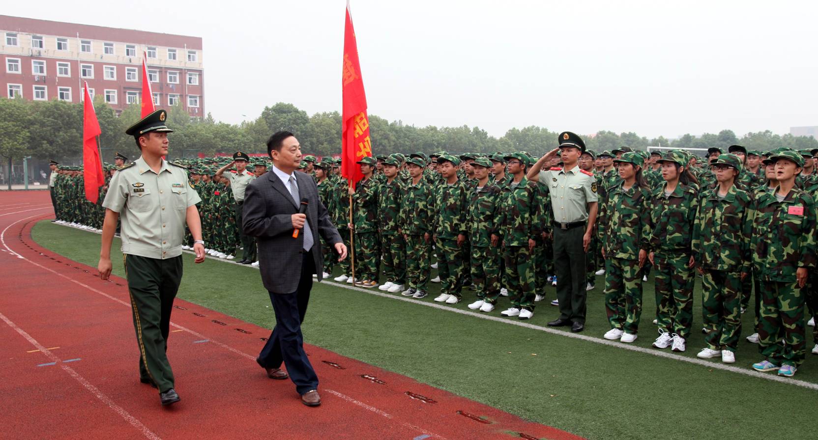 新生们昂首阔步走过主席台接受领导检阅