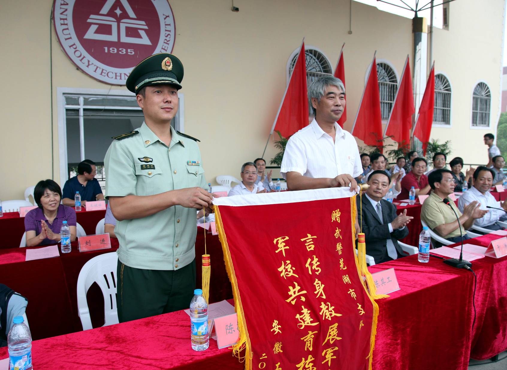 阅兵式后,校党委书记陈其工向军训承训部队武警芜湖市支队赠送了锦旗。