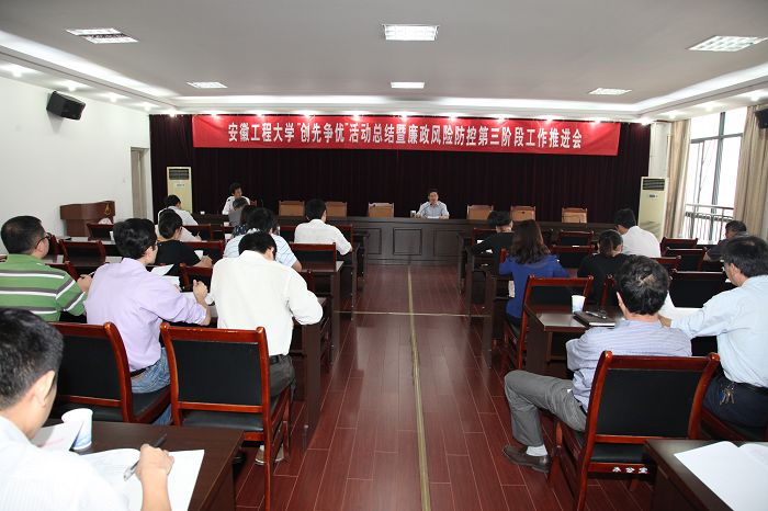 为及时贯彻落实党委书记陈其工在安徽工程大学创先争优活动总结暨廉政风险防控第三阶段工作推进会上的讲话精神,进一步加大廉政风险防控工作的推进力度,确保第三阶段工作取得显著成效。9月27日下午,学校防控办召开校级领导协调员、联络员以及35个处级单位的联络员参加的廉政风险防控第三阶段工作会。学校党委委员、纪委书记汪奇燕出席会议并讲话。纪委副书记朱成全就廉政风险防控工作进行了周密详细的部署。会议由监察处副处长余传文主持。
