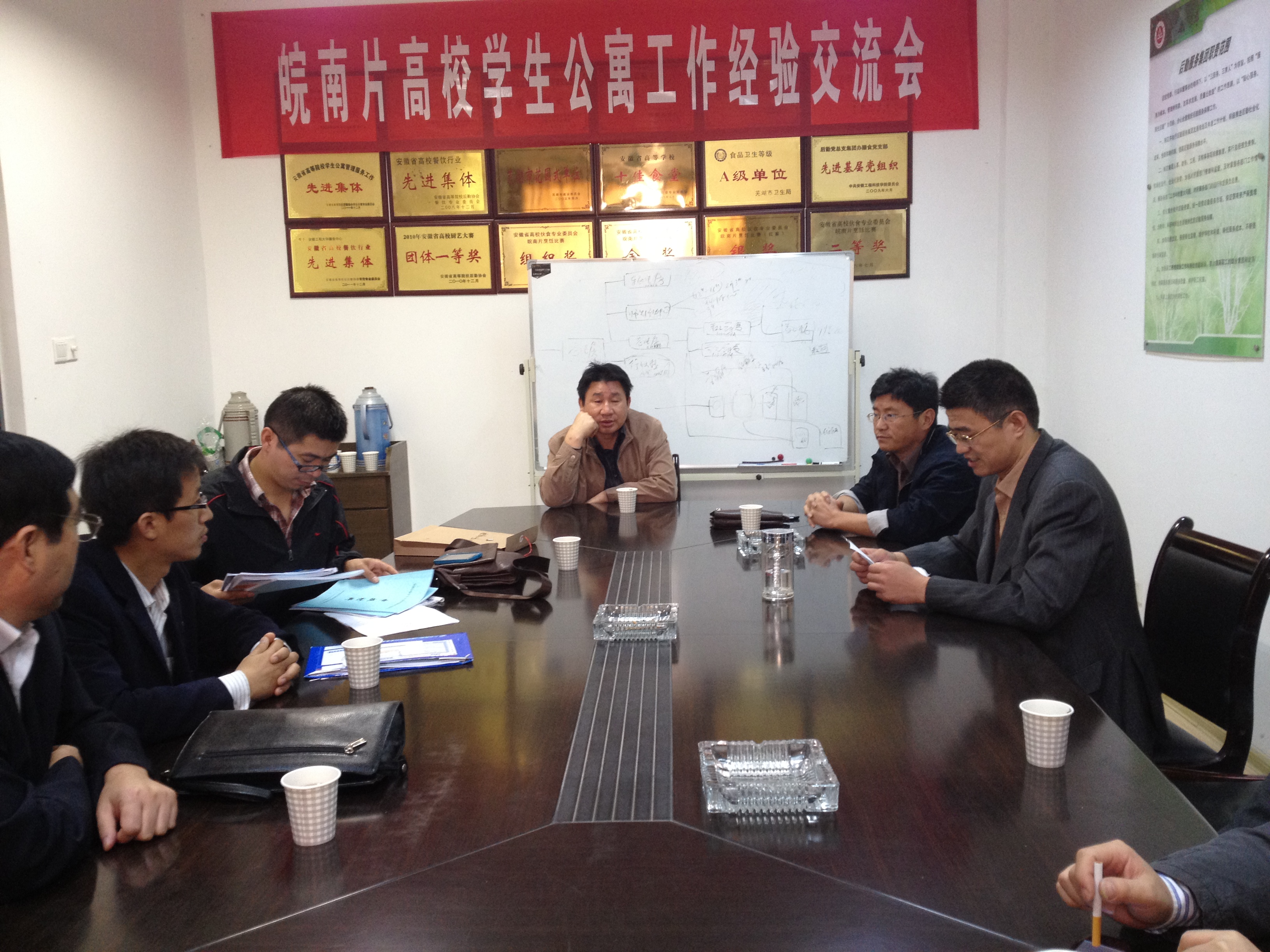 2012年10月23日上午,“全国高校学生公寓管理服务先进单位及个人” 皖南片高校评选推荐会在安徽工程大学召开。安徽工业大学、皖南医学院、池州学院、安庆师范学院等皖南片高校申报单位参加了本次会议。省寓专会皖南片片长单位安徽工程大学后勤集团纪天新副总经理主持会议。省寓专会主任单位安徽工业大学后勤集团刘绍兵副总经理通报了省寓专会关于评选“全国高校学生公寓管理服务先进单位及个人”的相关要求。会议讨论通过皖南片高校申报“全国高校学生公寓管理服务先进单位及个人”评选排序办法,投票产生了“全国高校学生公寓管理服务先进单位”皖南片高校排序和“全国高校学生公寓管理服务先进个人”排序。