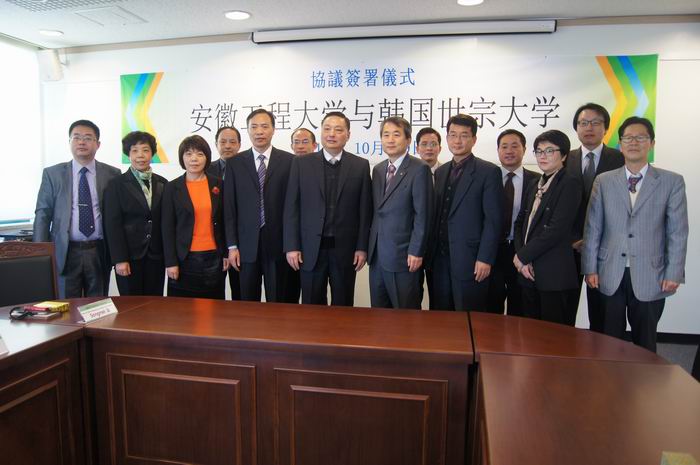 10月28日-29日,11月2日,代表团两次访问了韩国世宗大学,受得了校长申梂等一行的热情接待。两校校长先是进行了小范围的面谈,干洪指出,应世宗大学的邀请,我校此次来访是主要是全面拓展和深化安徽工程大学与世宗大学的友好合作,并借助世宗大学的教育教学资源,紧密结合双方学校的学科专业特色及契合度,从而开展包括合作办学、教师研修、科研合作等全面深入的校际战略合作,为两校师生,特别是优秀的青年师生提供更为优质更为广阔的教育教学资源。申梂对干洪校长一行的来到表示热烈欢迎,并十分赞同干校长提出国际化办学的理念和合作意向,同时表示双方将通过此次访问,尽快促成相关方面的合作。