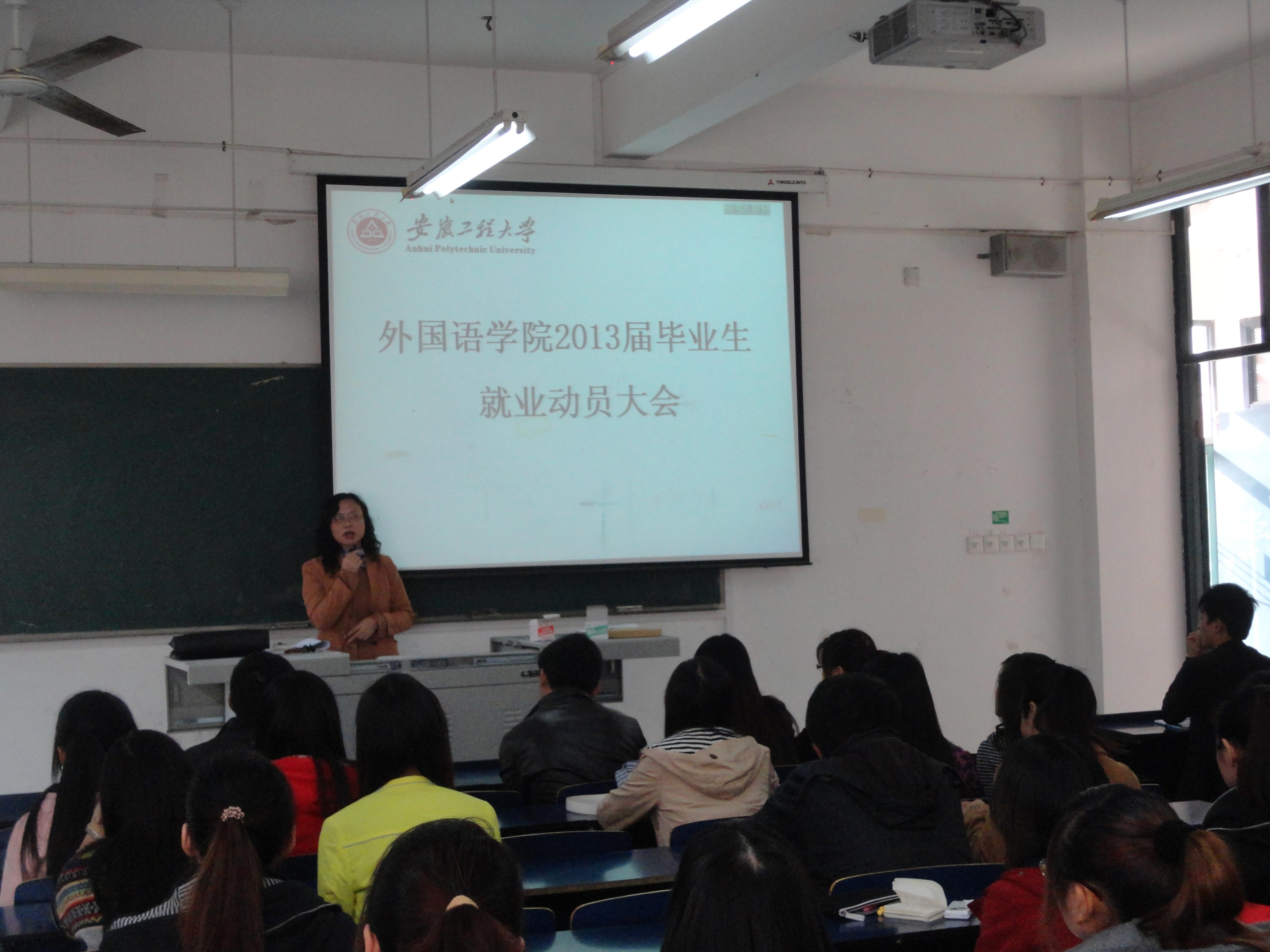 2012年11月7日下午,外国语学院在5J102举行2013届毕业生就业动员大会。外国语学院党总支副书记谈丽华出席会议并作专题讲话,会议由2013届毕业班辅导员李飞主持。