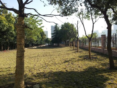 就地平整、填土300多立方,铺设草坪6900平方米,铺设马尼拉草坪2300平方米。