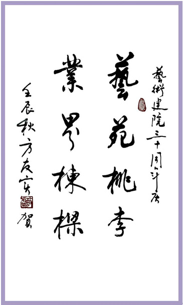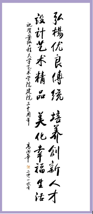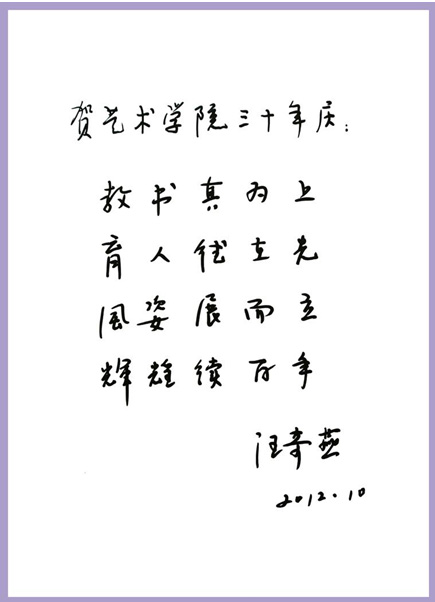 为庆祝安徽工程大学艺术学院建院三十周年,中共安徽省委教育工委常务副书记高开华、安徽工程大学党委书记陈其工和校党委副书记校长干洪等校党政领导、艺术设计界专家学者等,为艺术学院建院三十周年题词祝贺。同时,在11月18日的庆典大会上,芜湖市副市长詹云超、安徽工程大学副校长李震也发表了重要讲话。为深入学习贯彻各级领导为建院三十周年题词和讲话精神, 11月19日,艺术学院召开党政联席,会上,院领导首先带头学习了这些题词和讲话,并进行了讨论。大家一致认为,各级领导为艺术学院建院三十周年的题词和讲话,既是对艺术学院过去三十年办学成绩的肯定,更是对艺术学院今后发展的期盼。下一步,艺术学院将组织全体教工学习贯彻各级领导为建院三十周年题词和讲话精神,贯彻不久前校党委书记陈其工到艺术学院调研讲话精神,以学院三十周年的成就为新的起点,不辜负领导的重托和社会的期望,以“集中力量、重点突破、带动整体”为基本思路,以专业与学科建设为核心,以人才队伍建设为重点,加大师资队伍建设,加强学院内涵建设,全面推进教育事业“十二五”发展规划的贯彻落实。