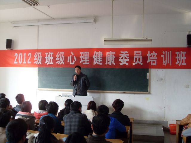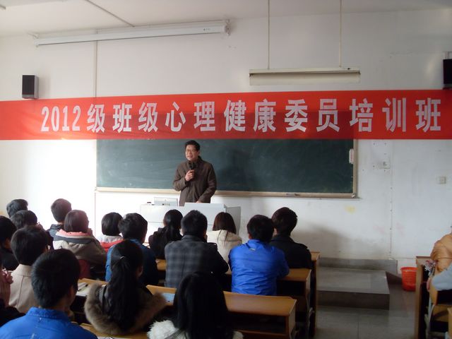 本期培训班培训对象为全校2012级116名班级心理健康委员和13名心理协会推荐的积极分子。培训目的是为了进一步完善我校心理健康教育三级网络机制,提升心理健康委员的心理素质和工作能力,充分发挥朋辈心理辅导作用。培训时间从11月24日到11月29日,培训形式为专题讲座、观看教学录像、体验式学习等。 开班仪式上, 接下来,胡家增副处长简要回顾了班级心理健康委员培训班的创办历程,就开展班级心理健康委员培训的重要性、开展此项工作对完善心理健康教育工作三级网络的意义跟同学们作了深入浅出的分析,对各班级心理健康委员的认真工作给予了肯定。班级心理健康委员作为学校心理健康教育三级网络的最基层,可以在工作中及时地发现和反馈大学生心理健康问题,对于提高全校大学生的心理健康水平有着很重要的意义。最后,胡家增副处长向参加培训的同学提出了要求,希望能在以后的工作中牢记自己的职责,发挥自己的作用,并预祝心理委员培训取得圆满成功。 在简短的开办仪式后,