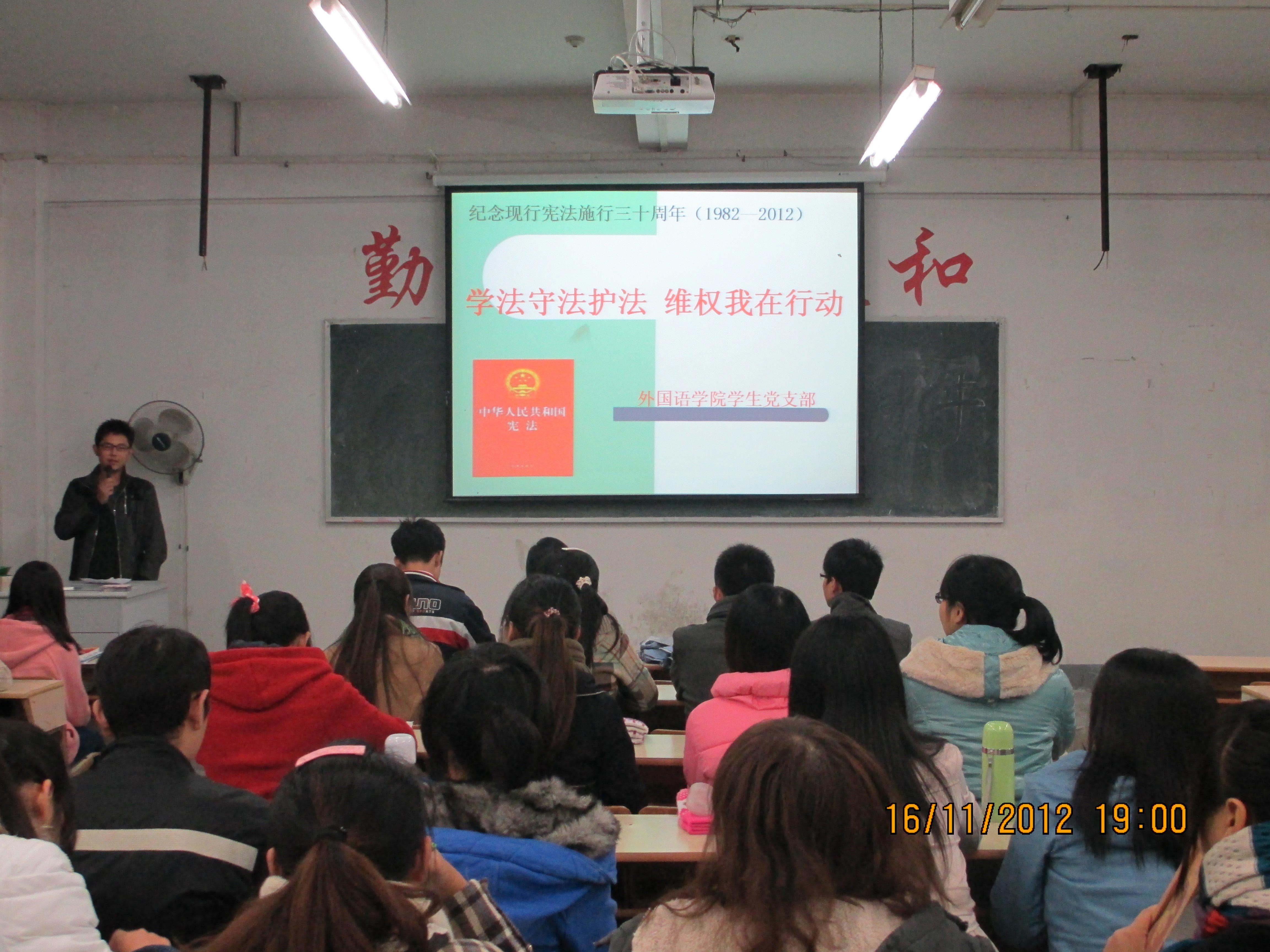 在庆祝中国共产党第十八次全国代表大会胜利召开之际,为纪念现行宪法施行三十周年,增强大学生的法制观念,外国语学院学生党支部举行现行宪法施行三十周年纪念活动。