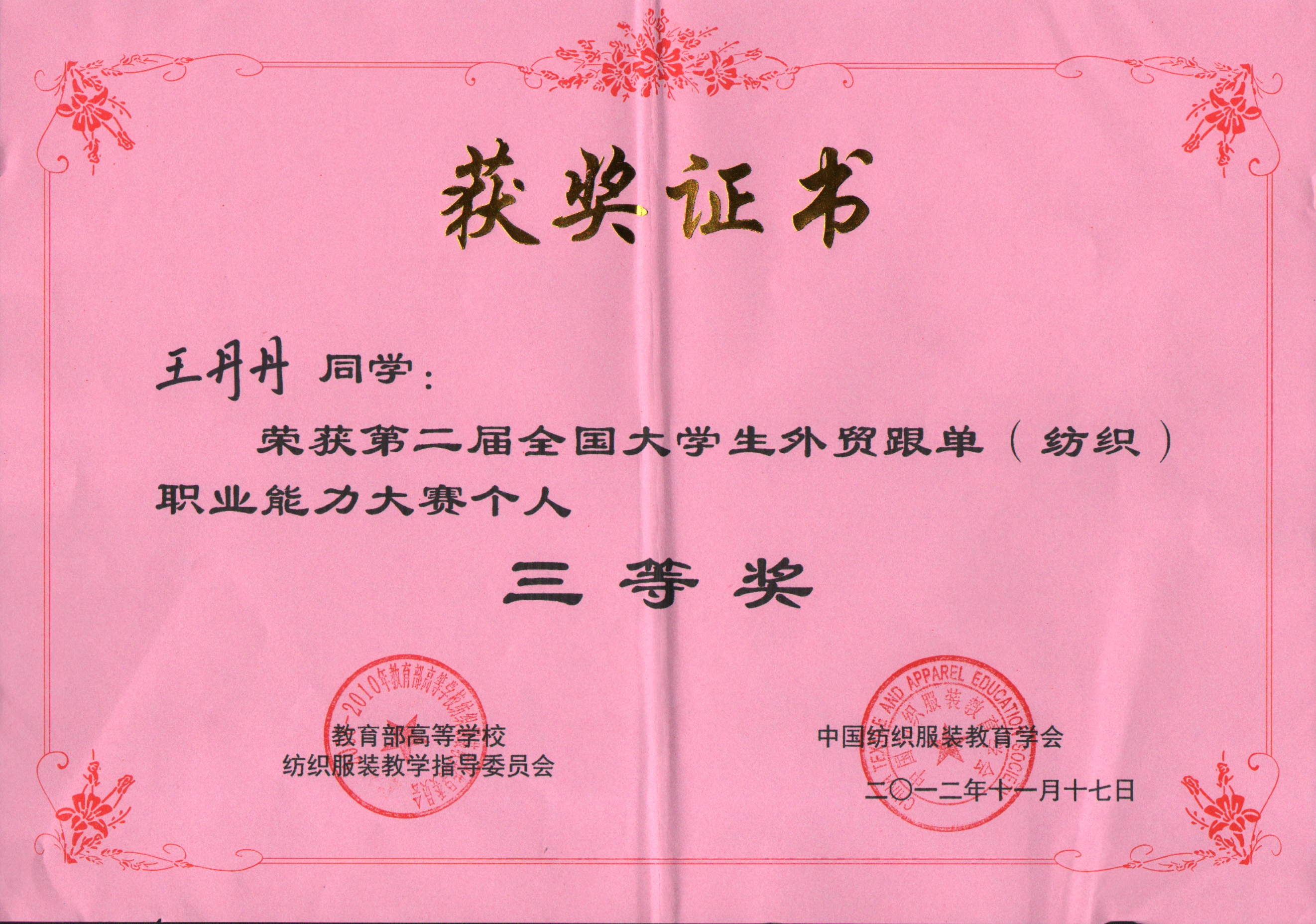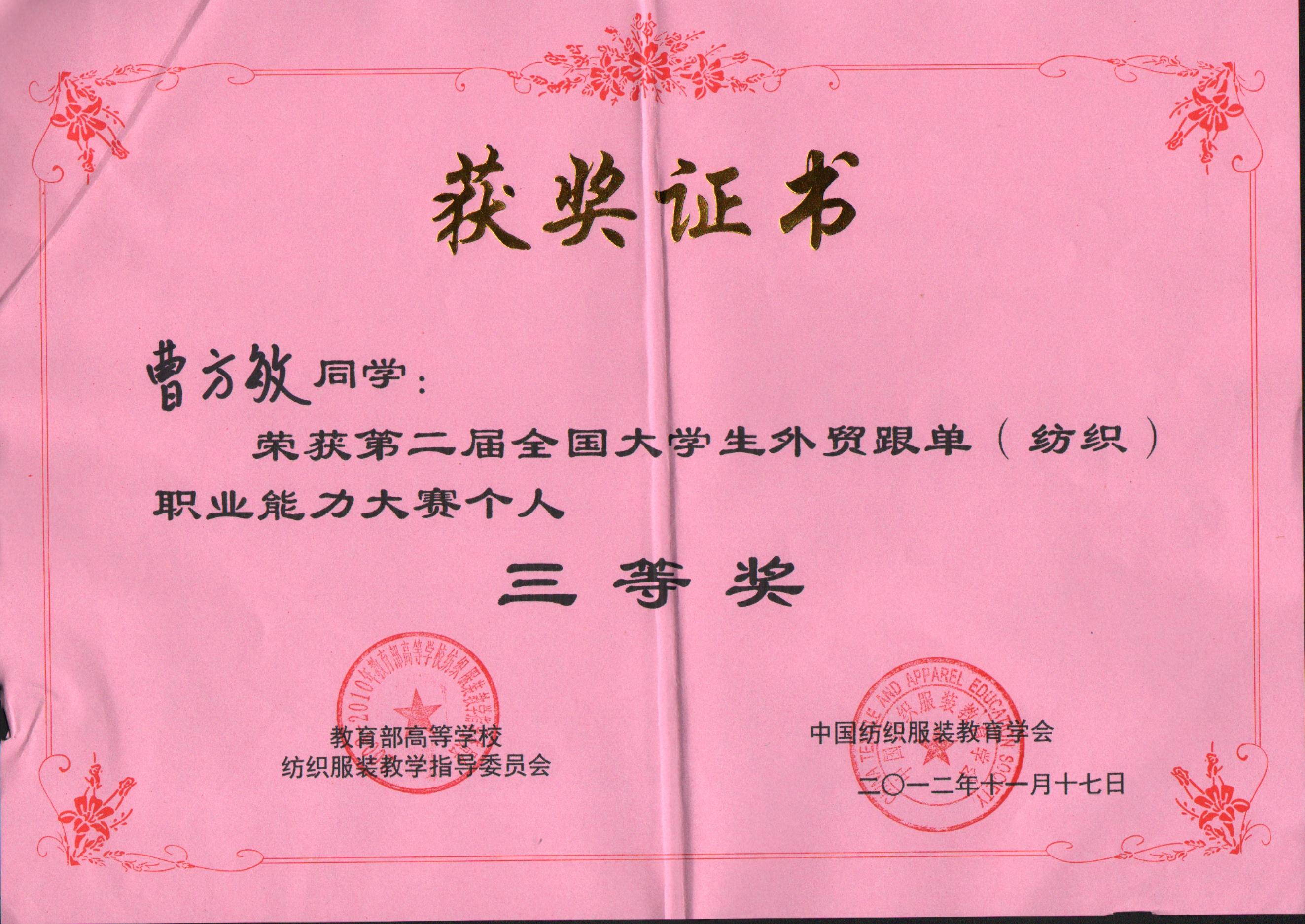 此次大赛是由教育部高等学校纺织服装教学指导委员会与中国纺织服装教育学会联合主办、东华大学承办的国家级赛事,吸引了来自全国20多所高等学校的近百名选手参赛。选手就纺织服装跟单理论知识与实务操作两部分展开了激烈的角逐。最终,经过两天紧张的比赛,我校纺织09级曹方敏和王丹丹同学以扎实的理论知识、沉着的心态、熟练的操作能力荣获个人三等奖,我校代表队荣获团体优胜奖,受到了大赛组委会和其他兄弟院校的好评,进一步提高了我校在全国纺织服装专业领域的知名度。
