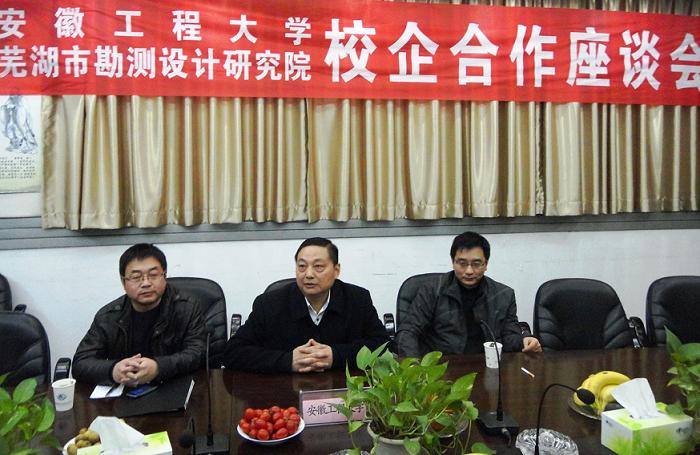 2012年12月5日下午,安徽工程大学与芜湖市勘测设计研究院产学研合作座谈会在市勘测院会议室举行。安徽工程大学校长干洪、组织部长郑健、建筑工程学院院长陆峰,市勘测院院长方新主、党委书记张继才、总工彭汝发、副总盛红星、夏秀槐及党政办、总工办负责同志等参加了座谈会。
