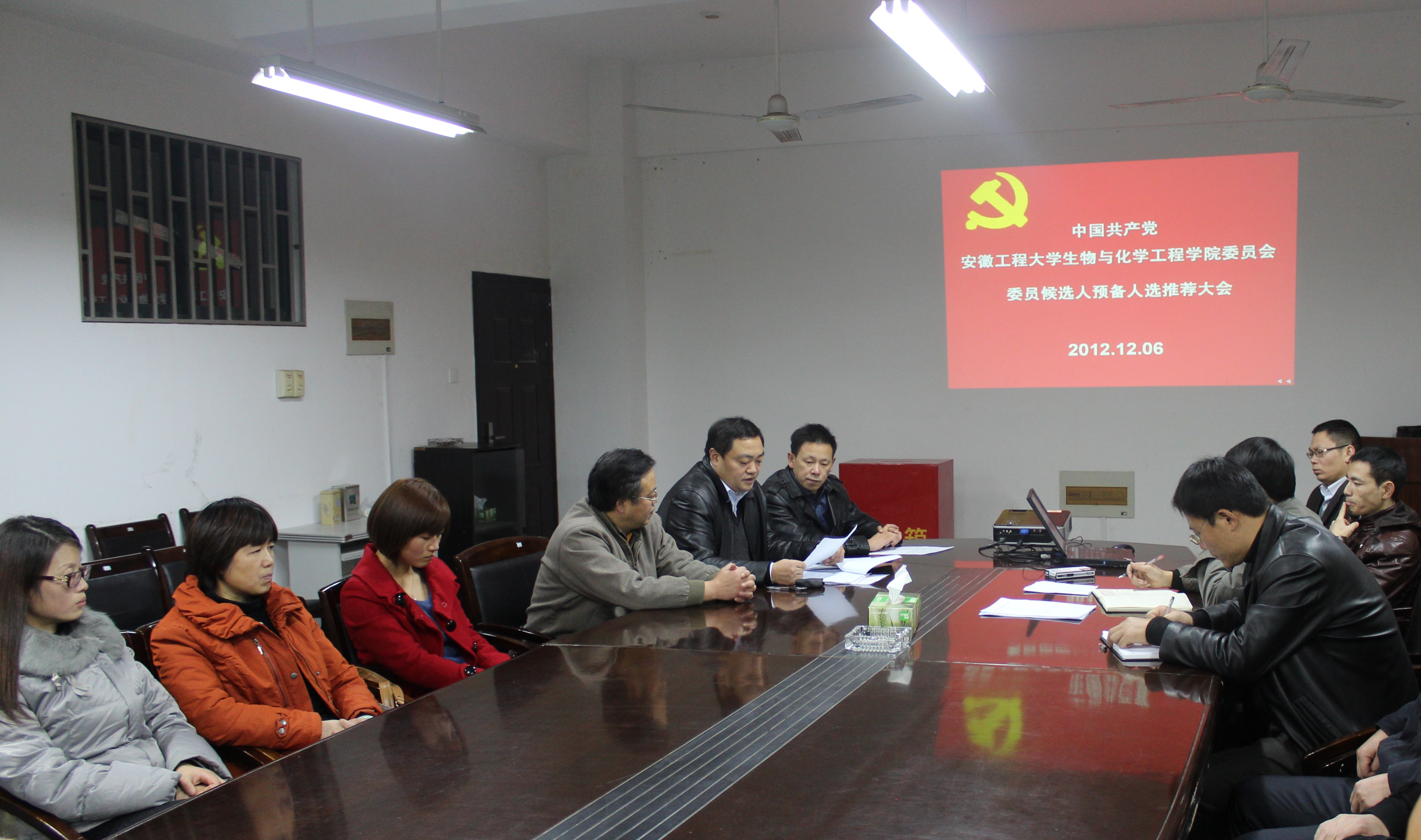 2012年12月6日下午5:30,中共安徽工程大学生物与化学工程学院委员会委员候选人预备人选推荐大会在学院会议室举行。学院党委书记王弘、党委副书记章兵、副院长陶玉贵出席大会,支部委员、科级以上干部(含享受科技干部政治待遇人员)、工会主席(副主席)、副高及以上专业技术职务中的党员同志参加大会。大会由王弘同志主持。