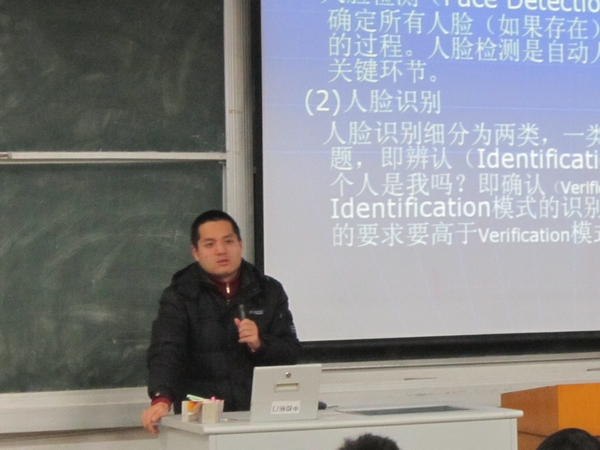 卢博士主要从人脸识别研究的意义、现状、过程及关键技术四个方面介绍了人脸识别技术。卢博士指出:人脸识别技术侵害性低于虹膜、指纹等生物特征识别,而且它具有最直观、最易被接受特点,因此这种技术成为十分活跃的研究领域。他指出生物特征包括生理特征和行为特征,他通过对各种生物特征识别技术进行比较,突出了人脸识别的优越性,通过生物认证技术市场角度分析,指出人脸识别技术以需求量极大、成本低、识别速度快、识别方式友好等压倒性优势成为IT产业最为重要的技术之一。接着,他列举了国内外人脸识别技术的应用与研究现状,如:中科奥森人脸识别系统等,进一步说明了这种技术的先进性。随后,他又介绍了该技术的研究方法:基于几何特征、代数特征、连接机制的人脸正面自动识别方法。最后,卢博士指出该项技术涉及面部形态、视觉特征、光照、姿态等一系列关键性问题,并强调这是个极其复杂且富挑战性的课题,并希望有这方面研究兴趣的同学能够在这个领域做出自己的贡献。