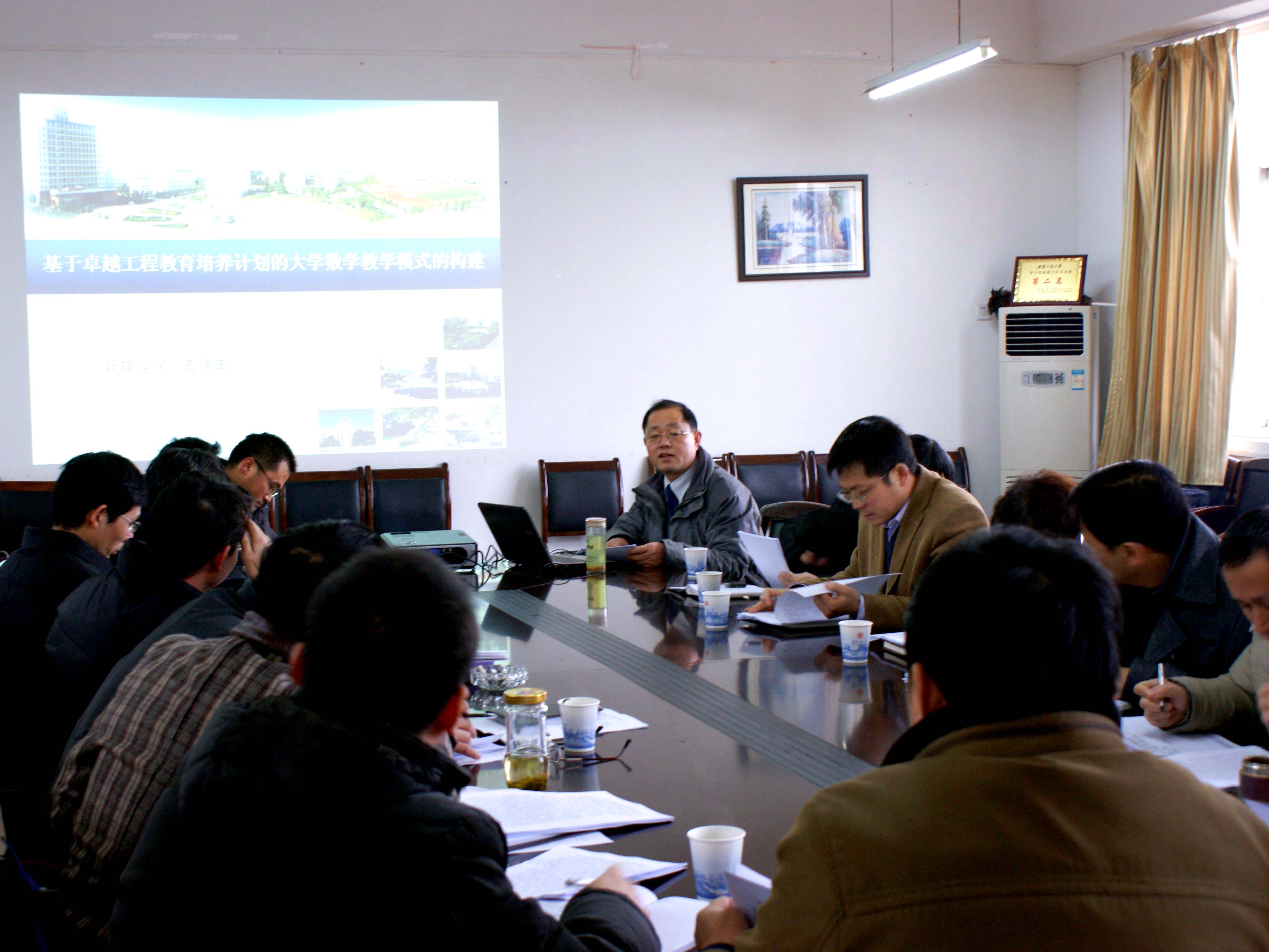 王传玉代表数理学院作了“大学数学教学模式构建”的汇报。汇报中他指出:教育部启动“卓越工程师教育培养计划”是高校培养高素质应用型人才的重要改革。学校高度重视大学数学的教学改革,数理学院也给予了高度的重视,在充分调研的基础上,数理学院构建了我校大学数学教学的“一个目标、两个意识、三个结合、五类课程组、一个体系”的“12351”模式,并将这个模式供相关学院研讨。