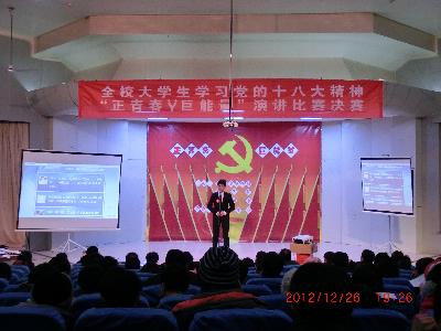 因为青春,昂扬激情;因为激情,无惧挑战;演青春之美丽,讲青春之风采;同学们用实践让青春之花绽放,在奋进中释放青春正能量。本次演讲比赛同时作为共青团系统学习贯彻党的十八大精神的活动之一,历时一个月,经过各学院团委组织的预赛、校团委组织的复赛,共16名选手进入三部门联合的总决赛,最终评出一、二、三等奖各二、四、十名,纺服学院谢潇同学和人文学院杨方同学分获一等奖。(校团委宣传部 黄旭 包品芳)