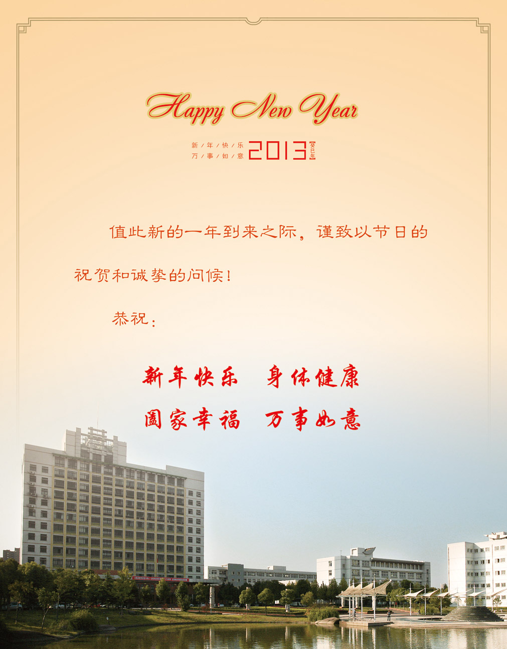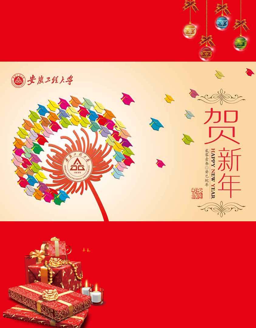 瑞雪飘临辞旧岁,银蛇曼舞迎新春。 在这辞旧迎新之际,学校专门设计制作了新年电子贺卡,恭祝全校师生员工、海内外校友和关心支持安徽工程大学发展的社会各界人士: 新年快乐、吉祥如意、阖家团圆、幸福安康! 2013年2月8日下午宣传部